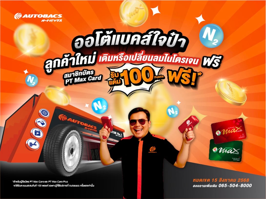 ออโต้แบคส์ ประเทศไทย (Autobacs Thailand) ศูนย์บริการบำรุงรักษารถยนต์ครบวงจร มาตรฐานจากญี่ปุ่น ในกลุ่มบริษัท พีทีจี เอ็นเนอยี จำกัด (มหาชน) หรือ PTG จัดแคมเปญสุดพิเศษสำหรับลูกค้าใหม่ที่ยังไม่เคยเข้ามาใช้บริการที่ ออโต้แบคส์ (AUTOBACS) ได้มีโอกาสเข้ามาสัมผัสประสบการณ์สุดเอ็กคลูซีฟครั้งแรก ด้วยการรับสิทธิ์เติมหรือเปลี่ยนลมไนโตรเจนฟรี! ผู้ถือบัตร PT Max Card Premier, PT Max Card Plus และ PT Max Card Plus EV รับคะแนนสะสม PT Max Card Points ฟรี! 100 คะแนน กรณีที่ลูกค้ายังไม่มีบัตรสมาชิก สามารถสมัครได้ที่หน้าสาขาเพื่อรับคะแนน ตั้งแต่วันนี้ – 15 สิงหาคม 2568 ณ ศูนย์บริการบำรุงรักษารถยนต์ครบวงจรออโต้แบคส์ (AUTOBACS) ทุกสาขาทั่วประเทศ
