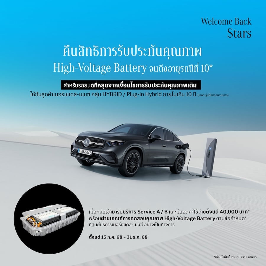 เมอร์เซเดส-เบนซ์ (ประเทศไทย) เปิดแคมเปญบริการหลังการขาย “Welcome Back Stars” ปีที่ 2 ชวนลูกค้ารถยนต์กลุ่ม Hybrid และ Plug-in Hybrid ที่มีอายุการใช้งานไม่เกิน 10 ปี ให้กลับมารับสิทธิการรับประกันคุณภาพแบตเตอรี่แรงดันสูง (High-Voltage Battery) เป็นระยะเวลาสูงสุดถึง 10 ปี* นับตั้งแต่วันที่ส่งมอบรถ สำหรับลูกค้าที่เคยหลุดจากเงื่อนไขการรับประกันคุณภาพเดิม โดยครอบคลุมรถยนต์กว่า 22 รุ่น ตามรุ่นรถยนต์และรหัสตัวถังที่กำหนด สำหรับลูกค้าที่สนใจสามารถนำรถยนต์เข้ามารับบริการและตรวจสอบสิทธิการรับประกันของรถยนต์ในแต่ละกลุ่ม ได้ที่ศูนย์บริการเมอร์เซเดส-เบนซ์ อย่างเป็นทางการ ทั่วประเทศ ตั้งแต่วันที่ 15 กรกฎาคม 2568 – 31 ธันวาคม 2568
