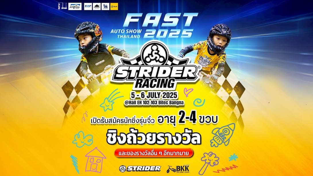พร้อมขอฝากกิจกรรมสำหรับนักซิ่งฟันน้ำนม กับการแข่งขันจักรยานขาไถ “Strider Racing @Fast Auto Show Thailand 2025” บนสนามแข่งมาตรฐาน สำหรับเยาวชนอายุ 2 - 4 ปี จัดแข่ง 2 รุ่น คือ รุ่น Enjoy และรุ่น Racing รวม 14 รุ่น เพื่อชิงถ้วยและเหรียญรางวัล ในวันเสาร์ที่ 5 และวันอาทิตย์ที่ 6 กรกฎาคม สมัครออนไลน์ได้ถึงวันที่ 30 มิถุนายน ศกนี้ ติดตามรายละเอียดได้ที่ https://form.jotform.com/251512312965453 หรือสมัครหน้างานในวันแข่งขัน