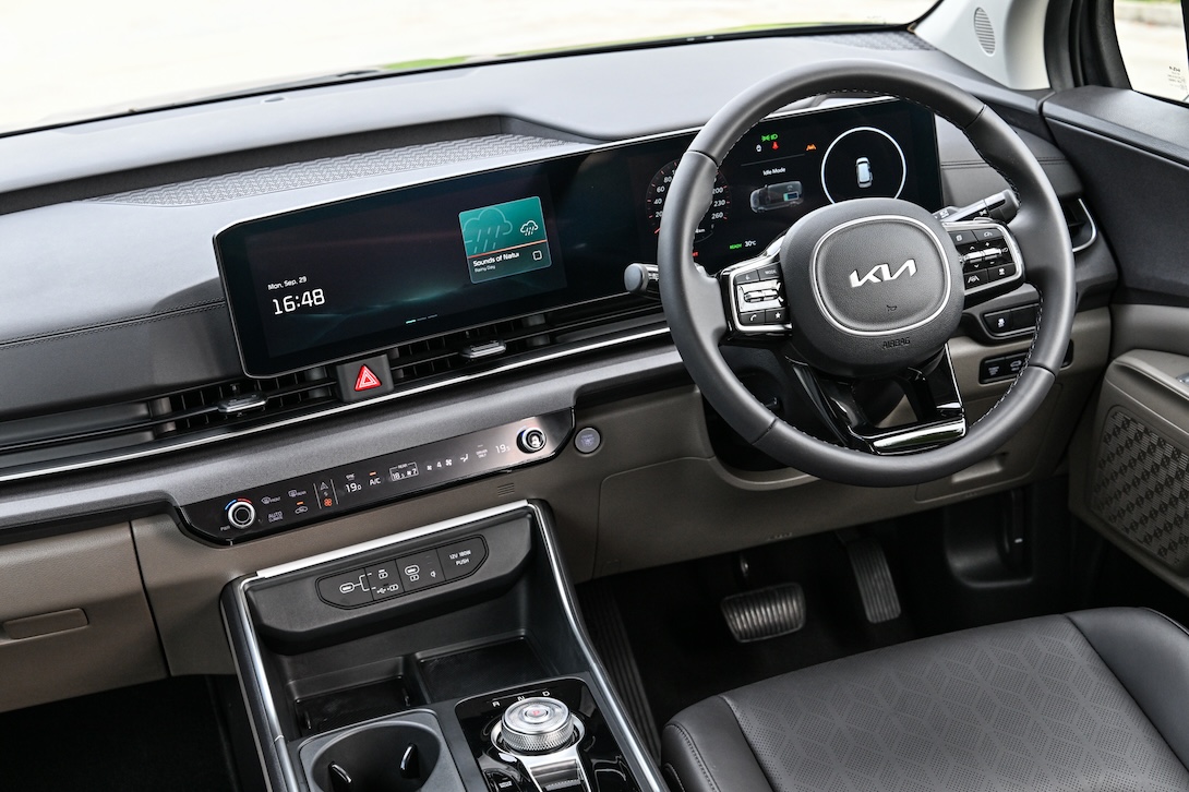 ห้องโดยสารของ The new Kia Carnival HEV 7-seater ได้รับการออกแบบให้กว้างขวางและร่วมสมัยด้วยดีไซน์ใหม่ ประกอบด้วยจอโค้งแบบพาโนรามิกที่ผสานรวมจอแสดงผลแบบคลัสเตอร์ขนาด 12.3 นิ้ว หน้าจออินโฟเทนเมนท์แบบสัมผัสขนาด 12.3 นิ้ว เข้าไว้ด้วยกันแบบไร้รอยต่อ มีระบบเชื่อมต่อ Android Auto™ และ Apple CarPlay® แบบไร้สายและฟังก์ชันสั่งงานด้วยเสียง มีระบบปรับอากาศด้านหน้าแบบอัตโนมัติที่สามารถปรับอุณหภูมิได้แบบแยกอิสระทั้งโซนด้านหน้าฝั่งซ้าย-ขวา และโซนด้านหลัง นอกจากนี้ยังมีสวิตช์สำหรับสลับการควบคุมระบบอินโฟเทนเมนต์และระบบปรับอากาศที่ผสานการควบคุมทั้งระบบไว้บนอินเตอร์เฟซเดียวกัน เพียงแค่สัมผัสหนึ่งครั้งก็สามารถสลับการควบคุมไปมาระหว่างระบบอินโฟเทนเมนต์กับระบบปรับอากาศ ช่วยลดความซับซ้อนของเลย์เอาต์ในขณะที่ยังคงความสะดวกในการใช้งาน และภายในห้องโดยสารยังได้ติดตั้งพอร์ต USB-C มาตรฐาน รวม 6 พอร์ตกระจายทั้งสามแถวที่นั่ง ช่วยให้ผู้โดยสารสามารถชาร์จอุปกรณ์ของตนได้อย่างสะดวกไม่ว่าจะนั่งอยู่ตำแหน่งใดของตัวรถ
