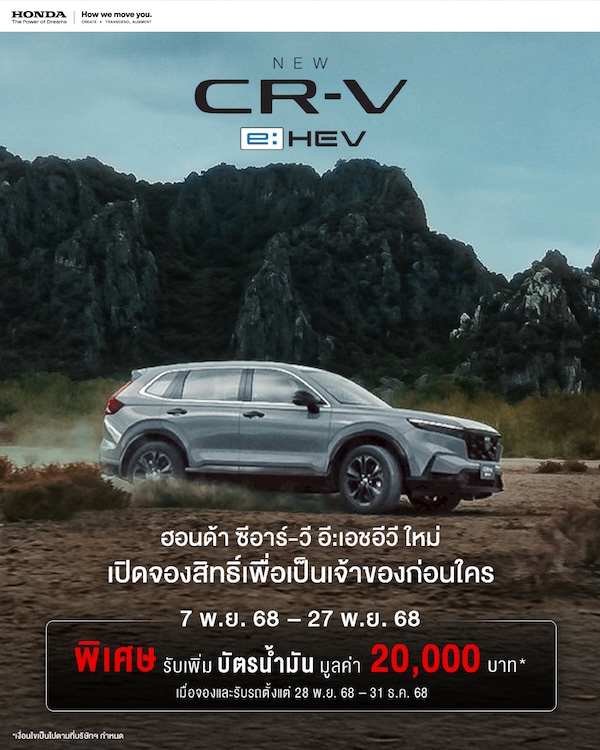 บริษัท ฮอนด้า ออโตโมบิล (ประเทศไทย) จำกัด แนะนำและเปิดรับจองสิทธิ์ ‘Honda CR-V e:HEV ใหม่’ รุ่นไมเนอร์เชนจ์ ปรับไลน์อัปเป็นฟูลไฮบริด e:HEV ในทุกรุ่นย่อย ให้ลูกค้าได้สัมผัสกับ SUV ไฮบริดสำหรับครอบครัวที่ครบและคุ้มค่าในราคาที่เข้าถึงง่ายยิ่งขึ้น ด้วยราคาประมาณการเริ่มต้นไม่เกิน 1,4XX,XXX บาท* จัดเต็มความคุ้มค่าด้วยฟีเจอร์ใหม่! อาทิ ระบบช่วยเตือนมุมอับสายตาที่กระจกมองข้าง (Blind Spot Information - BSI) ระบบเตือนเมื่อมีรถเคลื่อนผ่านขณะถอย (Cross Traffic Monitor - CTM) และแอปและบริการของ Google ที่ติดตั้งมาในตัว พร้อมทั้งอัปเกรดฟังก์ชันการใช้งานเพิ่มเติมในหลากหลายรุ่น** ครั้งแรก! กับรุ่นย่อยใหม่ e:HEV HuNT กับดีไซน์อัปลุคสะท้อนไวบ์ที่แตกต่างอีกขั้น และรุ่นย่อย e:HEV RS ที่มาพร้อมระบบขับเคลื่อน 2 ล้อ เพื่อตอบโจทย์ทุกความต้องการลูกค้าอย่างลงตัว พิเศษ! รับฟรีบัตรเติมน้ำมันมูลค่า 20,000 บาท*** พร้อมรับดอกเบี้ย 0.99%*** และฟรีประกันภัย 1 ปี สำหรับลูกค้าที่ลงทะเบียนจองสิทธิ์ล่วงหน้าเพื่อเป็นเจ้าของ Honda CR-V e:HEV ใหม่ ผ่านทางที่ปรึกษาการขายฮอนด้าที่โชว์รูมฮอนด้าทั่วประเทศ ตั้งแต่วันที่ 7 พฤศจิกายน 2568 – 27 พฤศจิกายน 2568 พร้อมจองและรับรถตั้งแต่วันที่ 28 พฤศจิกายน 2568 – 31 ธันวาคม 2568***