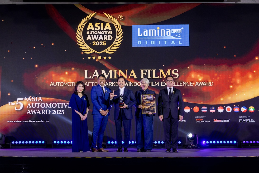 “ลามิน่าฟิล์ม” โดย นางสาวจันทร์นภา สายสมร ประธานเจ้าหน้าที่บริหาร บริษัท เทคโนเซล (เฟรย์) จำกัด รับรางวัลผลิตภัณฑ์ฟิล์มกรองแสงติดรถยนต์ยอดเยี่ยมระดับเอเชีย Automotive Aftermarket Window Film Excellent Award จาก Mr.Mohd Nazul Zahri CEO of Motonation ประเทศมาเลเซีย นายพีระพงศ์ เอี่ยมลำเนา CEO บริษัท กรังด์ปรีซ์ อินเตอร์เนชั่นแนล จำกัด (มหาชน) นางศิรพรรณ อ่อนอรรถ อุปนายกฝ่ายพัฒนาการส่งออกฯ สมาคมผู้ผลิตชิ้นส่วนยานยนต์ไทย ในงาน The 5th Asia Automotive Award 2025 – Thailand Chapter