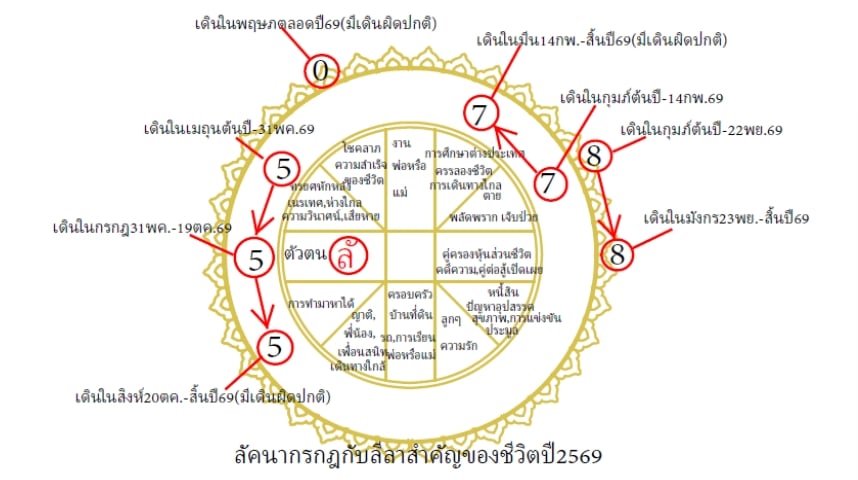 ตั้งแต่ต้นปี 2569 อะไรที่หนักหน่วงทางลบยังจะมีอยู่ แต่จะทยอยคลี่คลายคือกลางกุมภา.ได้ออกจากสถานการณ์ทุกข์หนักที่ถูกเล่นงานมาสองปีครึ่ง เพื่อเข้าสู่สภาวะใหม่คือ หาลาภได้เพียงแต่ต้องรักษาไว้ให้ได้ และปลายพฤษภา.หัวหน้าเทวดาประจำตัวมาคุ้มครองดวงชะตาเจิดจ้าอำนวยโชคชัยให้ชีวิต หลังจากนั้นจะเป็นโชคชัยเรื่องเงิน เพียงแต่ปลายพฤศจิกายนเป็นต้นไปต้องประคองชีวิตคู่ หุ้นส่วนชีวิต ทั้งระวังการเสี่ยง-วู่วามและคดีความ.