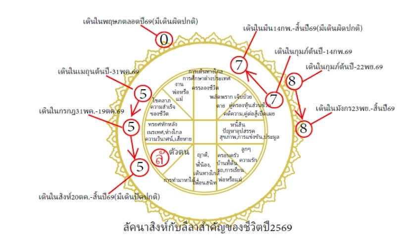 8.จอมลุ่มหลงมัวเมาที่เคยทำให้ดวงชะตาร้าว (ตามข้อ 3.) จะพลิกกลับตั้งแต่ 22 พฤศจิกายน 2569 เป็นต้นไป โดยอวยให้ดวงชะตาถึงสิ้นปี 2569 และยาวนานไปถึง 10 มิถุนายน 2571 เป็นเวลา 18 เดือน