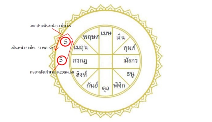 พฤหัสบดีจร (5)-เดินถอยหลังจากราศีกรกฎกลับเข้าราศีเมถุน เริ่มวันที่ 23 ธันวาคม 2568-31 พฤษภาคม 2569