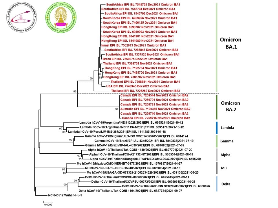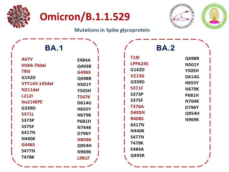 ทางศูนย์ไวรัสที่จุฬาฯ ได้ติดตามและเฝ้าระวังอยู่ ข้อมูล ณ ปัจจุบัน แสดงได้ดังรูปทั้งสอง ที่แสดงให้เห็นความแตกต่างของสายพันธุ์ BA1 และ BA2.
