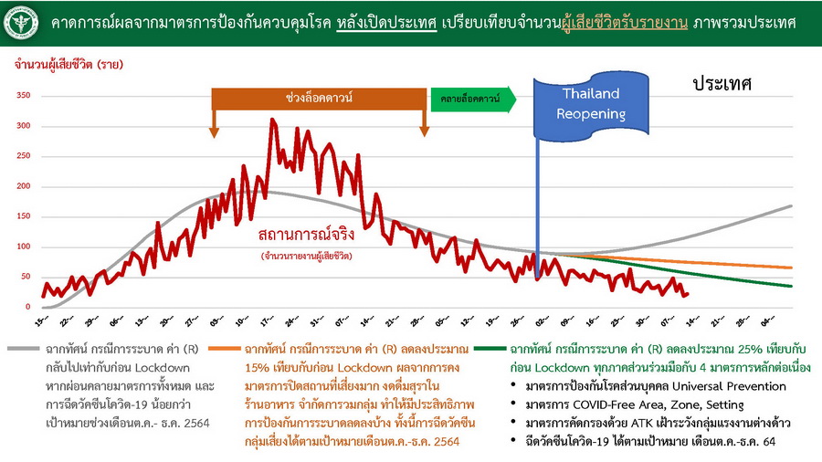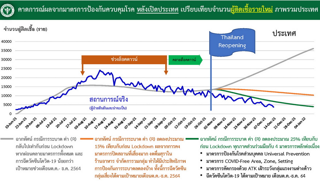นพ.ทวีศิลป์ กล่าวว่า สถานการณ์การติดเชื้อรายใหม่เมื่อเปรียบเทียบกับการคาดการณ์ถือว่าต่ำกว่าฉากทัศน์ เช่นเดียวกับอัตราการเสียชีวิตที่แนวโน้มยังต่ำกว่าเส้นฉากทัศน์เช่นเดียวกันนี่คือความรวมพลังพี่น้องประชาชนคนไทยที่ทำให้เรามาถึงวันนี้ได้ ซึ่งเราจะต้องผ่านเทศกาลปีใหม่นี้ หลังจากที่เราไม่ได้จัดมา 2 ปี โดยนายกฯระบุว่าต้องพยายามช่วยกันเพื่อให้เรามีเทศกาลดีๆนี้เกิดขึ้นในประเทศ
