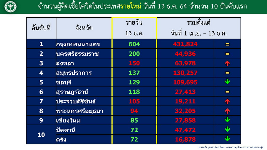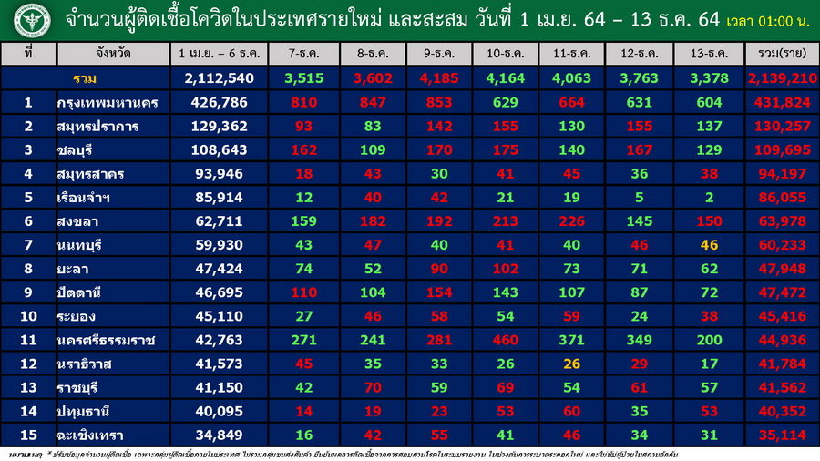 13 ธ.ค.2564 - ที่ทำเนียบรัฐบาล นพ.ทวีศิลป์ วิษณุโยธิน โฆษกศูนย์บริหารสถานการณ์การแพร่ระบาดของโรคติดเชื้อไวรัสโคโรนา 2019 (ศบค.) แถลงภายหลังการประชุมศบค.ชุดใหญ่ ที่มี พล.อ.ประยุทธ์ จันทร์โอชา นายกรัฐมนตรีและรมว.กลาโหม ในฐานะผอ.ศบค. เป็นประธานการประชุมว่า สำหรับสถานการณ์การแพร่ระบาดในประเทศไทยพบผู้ติดเชื้อรายใหม่ 3,398 ราย เป็นการติดเชื้อในประเทศ 3,376 ราย มาจากระบบเฝ้าระวังและระบบบริการ 3,368 ราย มาจากการค้นหาเชิงรุก 8 ราย มาจากเรือนจำ 2 ราย เป็นผู้เดินทางมาจากต่างประเทศ 20 ราย หายป่วยเพิ่มขึ้น 5,467 ราย อยู่ระหว่างรักษา 49,524 ราย อาการหนัก 1,061 ราย ใส่เครื่องช่วยหายใจ 307 ราย