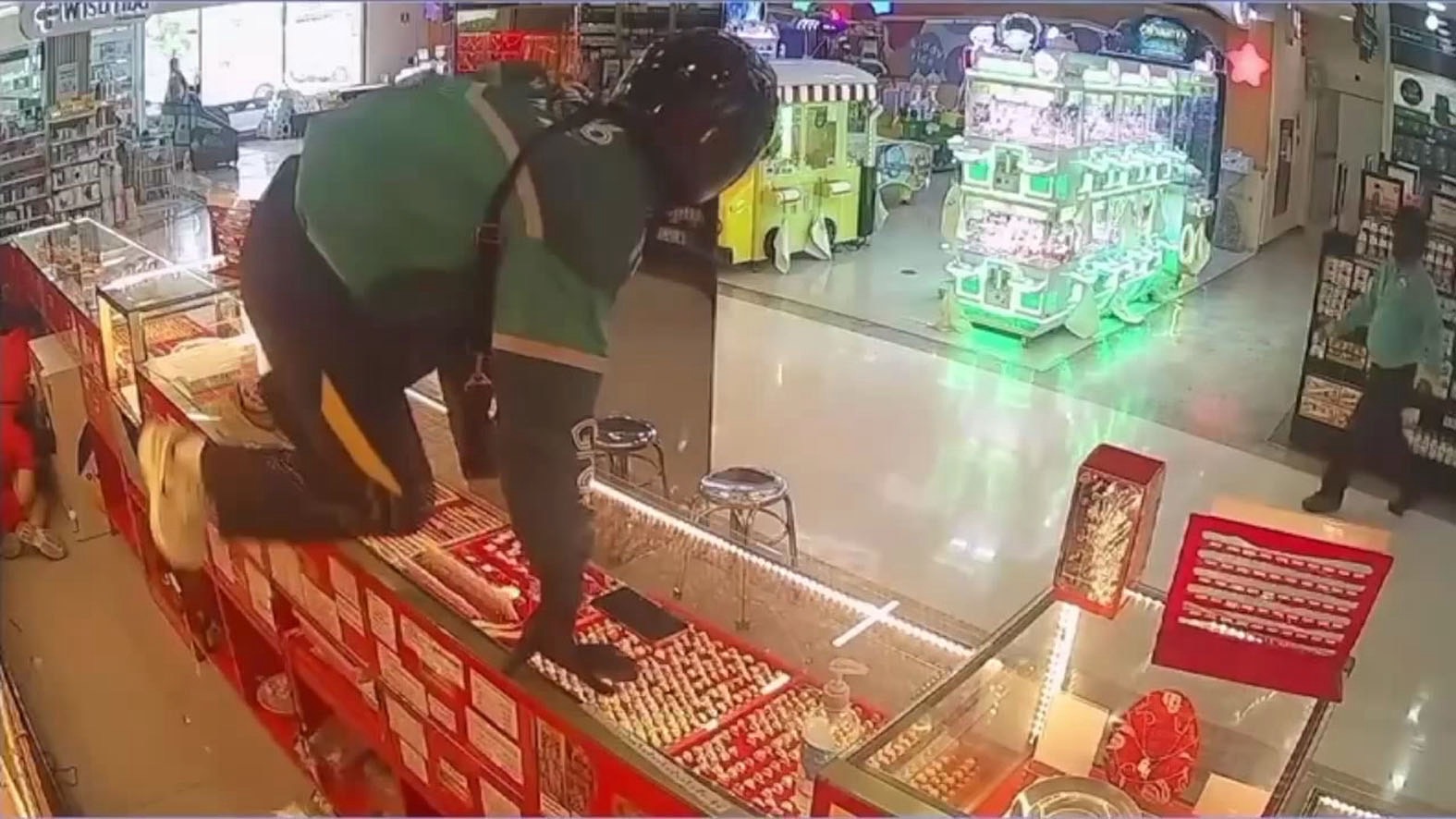 จากภาพกล้องวงจรปิด คนร้ายเป็นชาย สวมเสื้อไรเดอร์สีเขียว กางเกงขายาวสีดำ หมวกกันน็อกเต็มใบสีดำ สะพายกระเป๋าข้างสีดำ เดินเข้าห้างโดยไม่ถอดหมวกกันน็อก รปภ. พยายามห้ามแต่ถูกคนร้ายชักปืนพกสั้นข่มขู่ ก่อนบุกเข้าร้านทอง กระโดดข้ามเคาน์เตอร์ กวาดสร้อยทองใส่กระเป๋า แล้ววิ่งหนีขึ้นรถจักรยานยนต์สีดำ ไม่ติดป้ายทะเบียน ออกจากห้างไปทางถนนเทพรัตน
