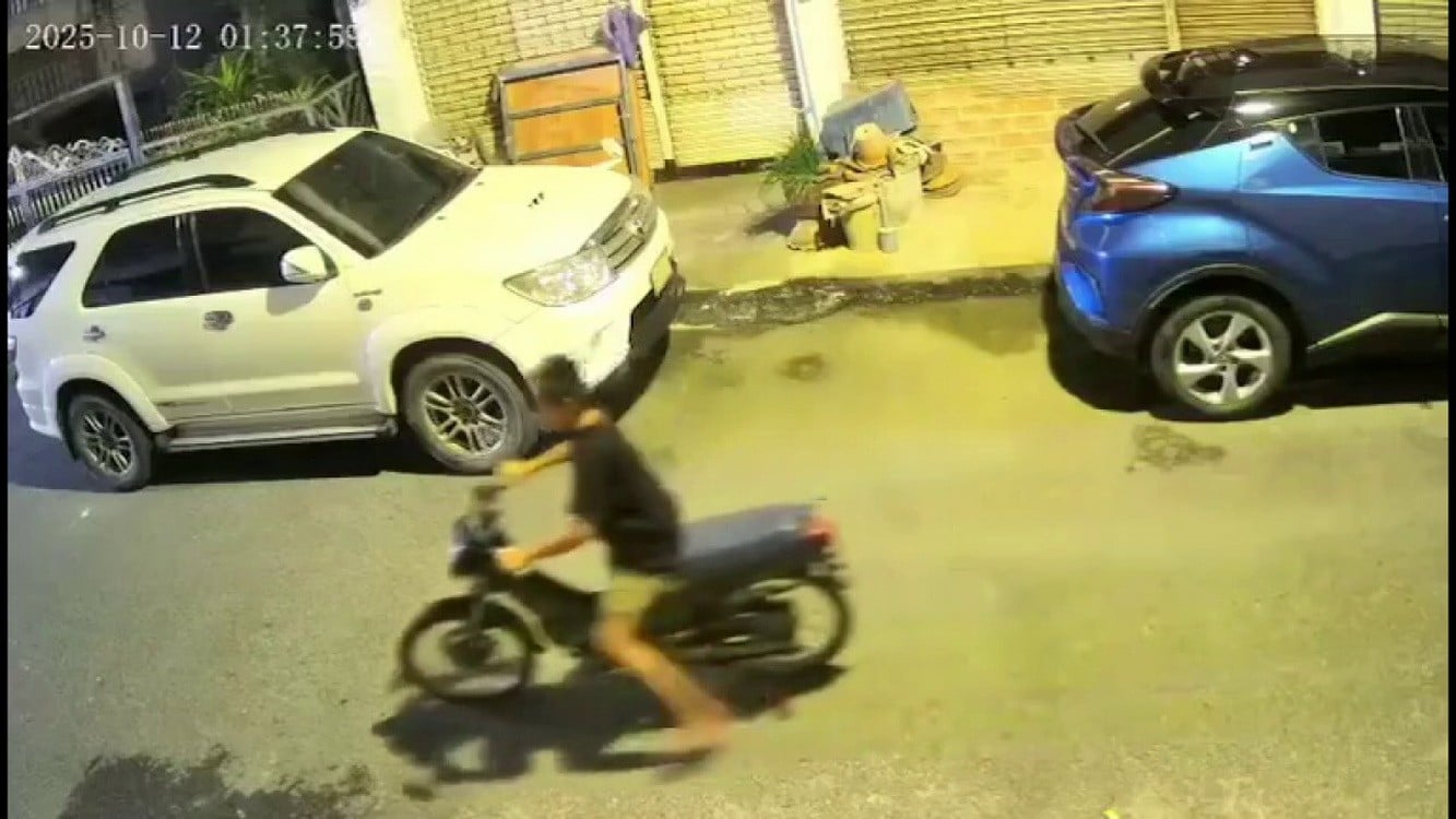 12 ต.ค.2568 – ผู้สื่อข่าวรายงาน คลิปภาพวงจรปิด พบว่าเวลาประมาณ 01.33 น. มีเยาวชน เด็กชายอายุราว 10–11 ปี สวมเสื้อยืดสีดำ กางเกงขาสั้น ขาข้างขวามีผ้าพันแผล บริเวณข้อเท้า เดินผ่านหน้าบ้านทำทีเหมือนเดินเล่น ก่อนจะขึ้นคร่อมรถและค่อย ๆ เข็นออกไปจากจุดเกิดเหตุ โดยกล้องวงจรปิดสามารถบันทึกภาพเหตุการณ์ไว้ได้อย่างชัดเจน