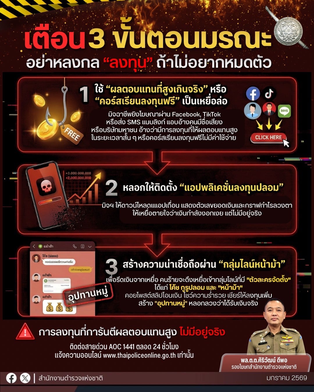 สำนักงานตำรวจแห่งชาติจึงขอเน้นย้ำกับพี่น้องประชาชนว่า “การลงทุนที่การันตีผลตอบแทนสูง ไม่มีอยู่จริง” หากพบเห็นการชักชวนให้โหลดแอปพลิเคชันผ่านลิงก์ หรือถูกดึงเข้ากลุ่มไลน์ที่เน้นโชว์กำไรจากการลงทุน ให้สันนิษฐานไว้ก่อนว่าเป็นมิจฉาชีพ