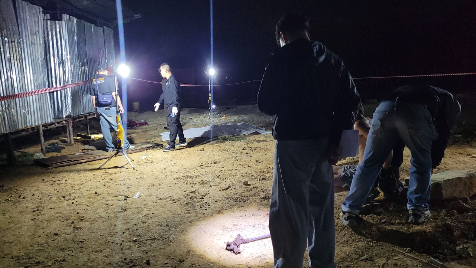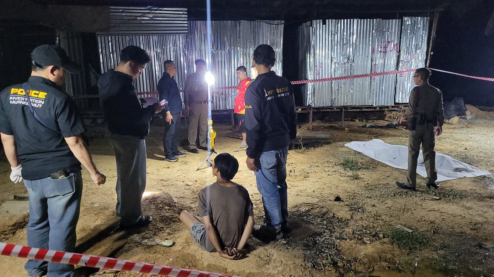 ที่เกิดเหตุเป็นแคมป์พักคนงานก่อสร้างหมู่บ้าน บริเวณกลางลานหน้าห้องพักคนงาน เจ้าหน้าที่ตำรวจพบศพ MR.TUN KHAING อายุ 27 ปี ชาวเมียนมา สภาพนอนคว่ำหน้าจมกองเลือด โดยที่ศีรษะถูกของแข็งทุบจนกะโหลกยุบ ตามร่างกายมีแผลผุพองจากการถูกไฟเผา เจ้าหน้าที่จึงปิดกั้นที่เกิดเหตุไม่ให้ผู้ที่ไม่มีส่วนเกี่ยวข้องเข้า พร้อมรายงานผู้บังคับบัญชาตามระดับชั้นทราบ และประสานเจ้าหน้าที่กองพิสูจน์หลักฐานกับแพทย์เวชนิติเวช