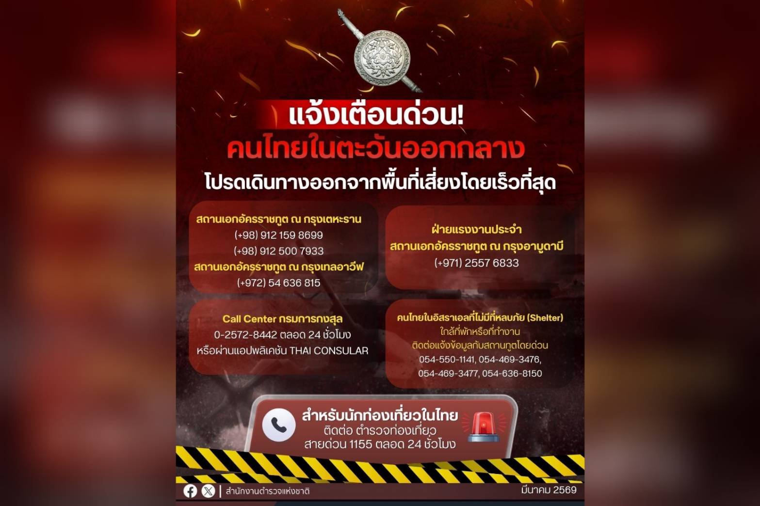 1 มี.ค.2569-เพจสำนักงานตำรวจแห่งชาติ โพสต์ข้อความระบุว่า แจ้งเตือนคนไทยในตะวันออกกลาง โปรดเดินทางออกจากพื้นที่เสี่ยงโดยเร็ว