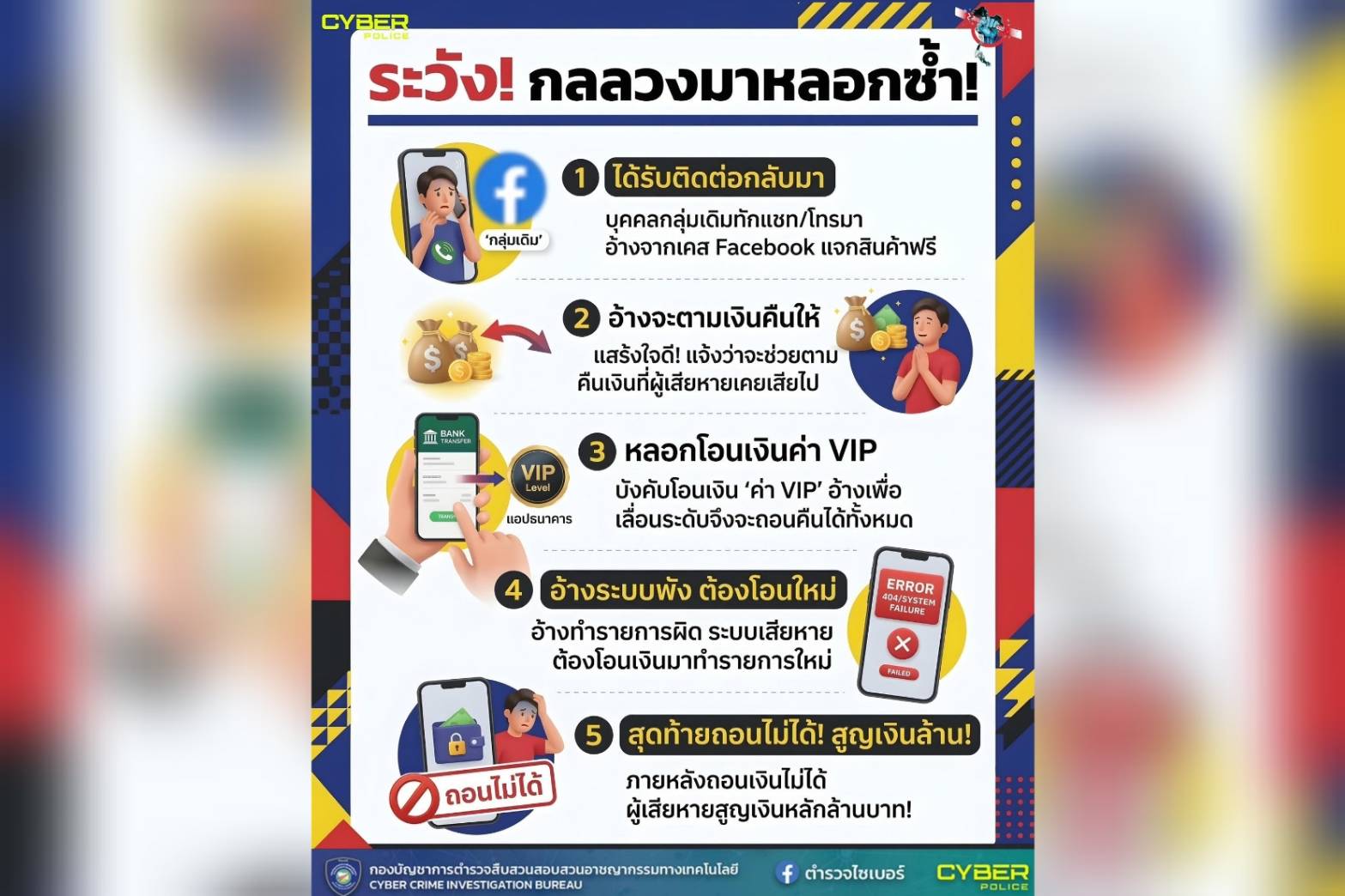 รูปแบบกลลวง “หลอกซ้ำซ้อน” ที่ต้องระวัง 1.ติดต่อเหยื่อรายเดิม: มิจฉาชีพจะสวมรอยหรืออ้างตัวเป็นผู้หวังดี แจ้งว่าสามารถตามเงินจากเคสเก่าคืนมาให้ได้ 2.หลอกให้โอนเงิน: อ้างว่าต้องมีการโอนเงิน “ค่า VIP” หรือค่าธรรมเนียมเลื่อนระดับก่อน จึงจะสามารถถอนเงินทั้งหมดคืนได้ 3.อ้างระบบพัง โอนเพิ่มไม่จบ: เมื่อเหยื่อโอนเงินไปแล้ว จะอ้างว่าทำรายการผิด ระบบเสียหาย และหลอกให้โอนเงินเข้าไปแก้ระบบเรื่อยๆ 4.สุดท้ายถอนไม่ได้: เมื่อเหยื่อรู้ตัวหรือเงินหมด ก็จะตัดการติดต่อหนีหายไปทันที
