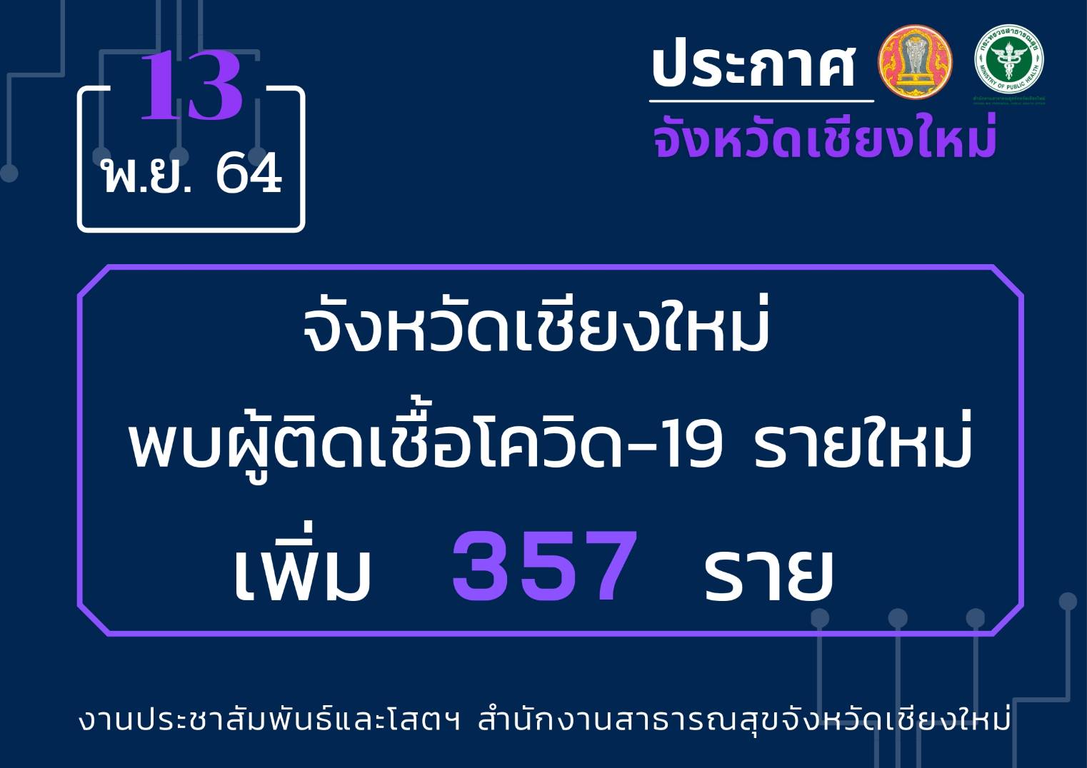 13 พ.ย.2564 - สถานการณ์การแพร่ระบาดโรคโควิด-19 จังหวัดเชียงใหม่ วันนี้ (13 พ.ย. 64) ยังพบผู้ติดเชื้อรายใหม่เพิ่ม 357 ราย โดยเป็นผู้ติดเชื้อในจังหวัด 347 ราย อีก 10 ราย เป็นผู้ติดเชื้อจากต่างจังหวัด ทำให้ยอดผู้ติดเชื้อสะสมตั้งแต่เดือนกรกฎาคม 2564 จนถึงปัจจุบัน อยู่ที่ 17,862 ราย ยังคงรักษาตัวอยู่ในโรงพยาบาลทุกประเภท จำนวน 4,866 ราย แยกเป็นโรงพยาบาลสนามจังหวัดเชียงใหม่ 214 ราย โรงพยาบาลสนามเฉพาะกิจ 87 ราย Community Isolation (CI) 2,268 ราย Home Isolation (HI) 430 ราย Hospitel 363 ราย โรงพยาบาลรัฐ 494 ราย โรงพยาบาลเอกชน 930 ราย และโรงพยาบาลต่างจังหวัด 80 ราย