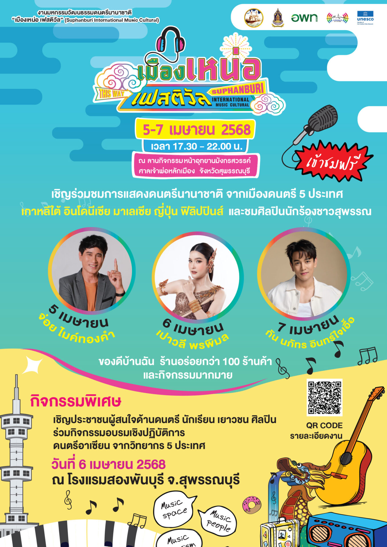ได้เวลา ระเบิดความมันส์ ไปกับเทศกาลดนตรี "เมืองเหน่อ เฟสติวัล 2568 Suphanburi Creative city of Music เพลิดเพลินกับคอนเสิร์ตจากศิลปินชื่อดัง จ่อย