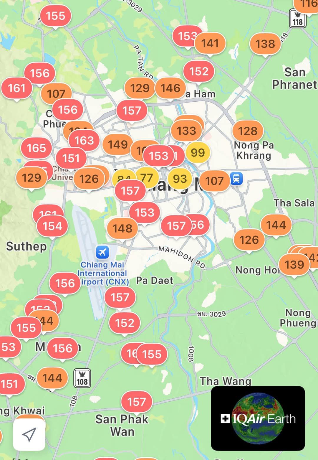 ส่วนในเชียงใหม่ก็มีค่าเกินมาตรฐานหลายพื้นที่โดยเฉพาะเขตเมืองก็ยังคงเกินมาตรฐานต่อเนื่องแม้จะมีพายุฝนตกมาก่อนหน้านี้เล็กน้อย