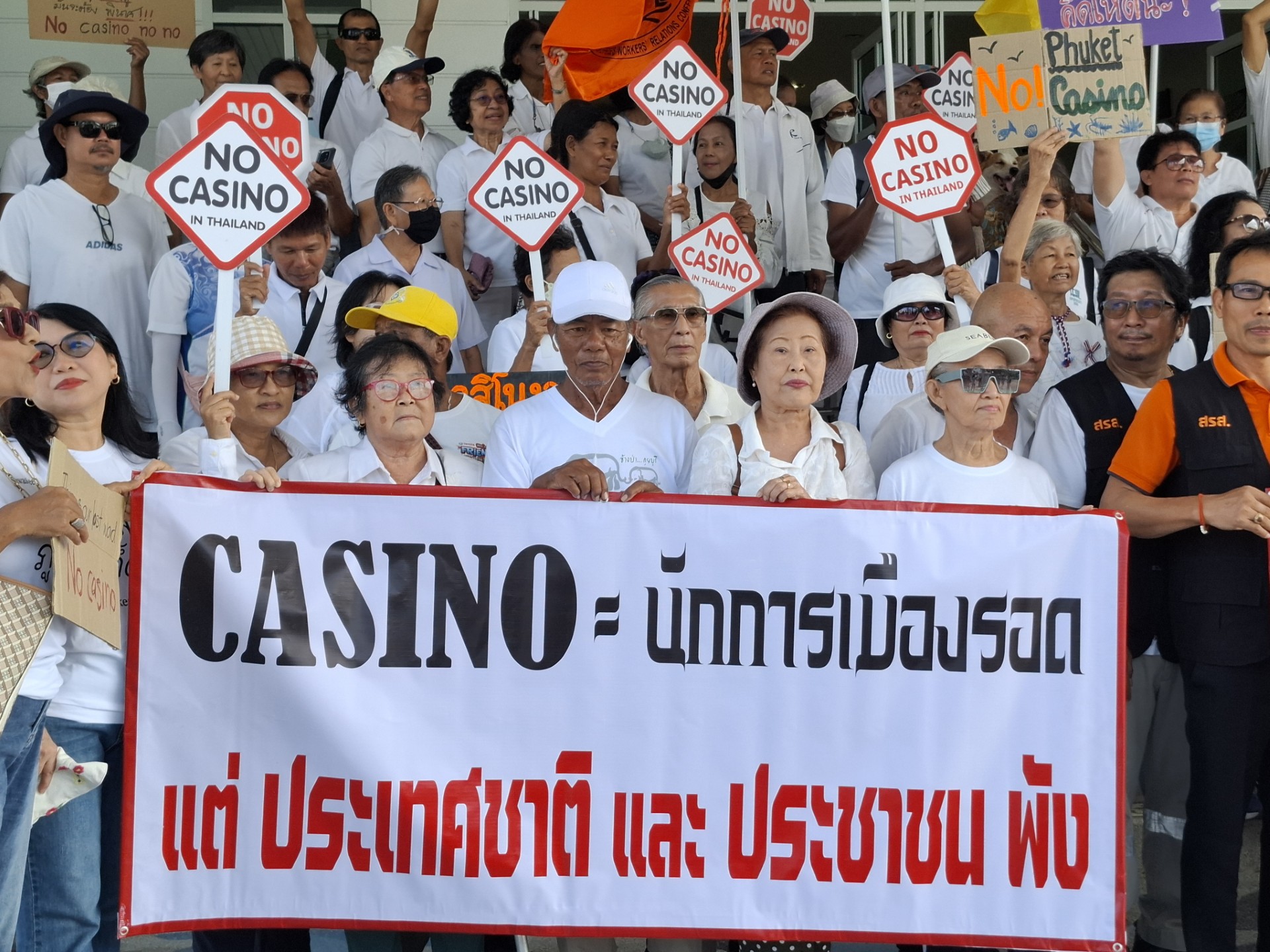 9 เม.ย.2568 - ชาวจังหวัดภูเก็ต และ สมาพันธ์แรงงานรัฐวิสาหกิจสัมพันธ์จังหวัดภูเก็ต กว่า 50 คน ถือป้ายข้อความ "ภูเก็ตไม่เอา คาสิโน" " CASINO = นักการเมืองรอดแต่ประเทศชาติและประชาชนพัง" "ชาวภูเก็ตไม่ขอทน No Casino in Thailand" "CASINO วาระเร่งด่วน ปากท้องประชาชน..ช่างมัน" รวมตัวกัน ยื่นหนังสือ แถลงการณ์คัดค้าน ร่างพระราชบัญญัติการประกอบการธุรกิจสถานบันเทิงครบวงจรและร่างพระราชบัญญัตินิรโทษกรรม โดยมี นายธีระพงศ์ ช่วยชู ปลัดจังหวัดภูเก็ต เป็นผู้รับหนังสือที่ ศาลากลางจังหวัดภูเก็ต อำเภอเมือง จังหวัดภูเก็ต