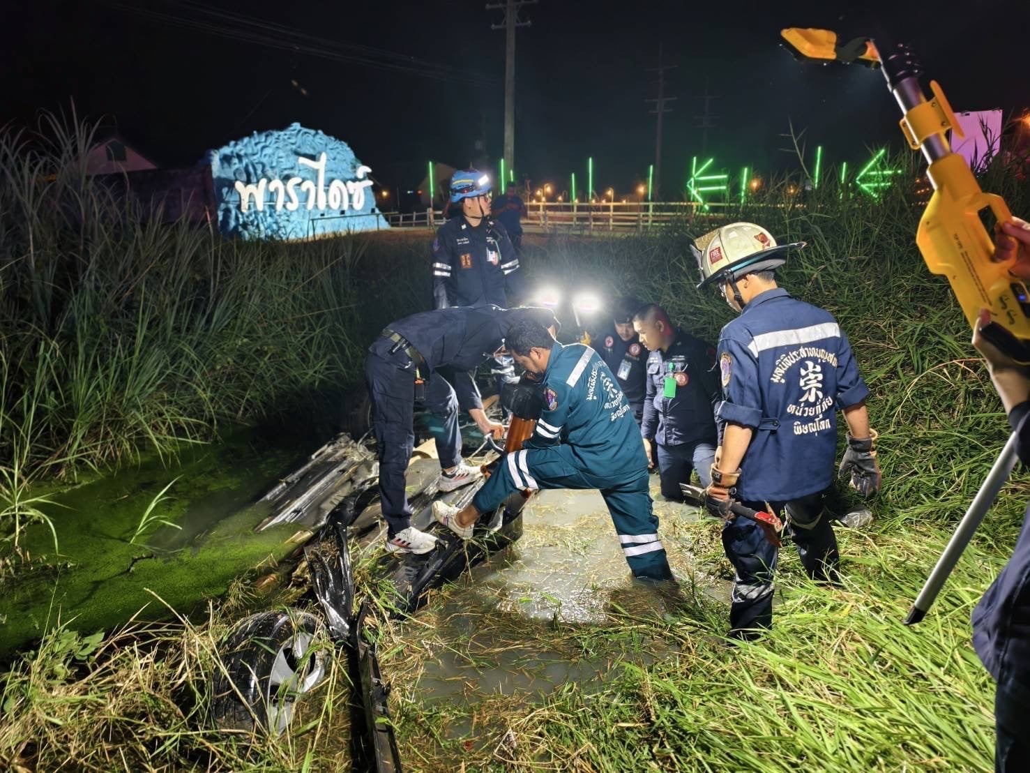 วินาทีกู้ภัยเร่งปั้มหัวใจคนขับรถเก๋งพุ่งชนท้ายรถบรรทุกพ่วงดังสนั่นกลางดึกก่อนเสียหลักพลิกคว่ำตกคูน้ำข้างทางล้อชีฟ้า กู้ภัยเร่งตัดถ่ายนำตัวคนขับออกมา CPR ก่อนส่งรักษาตัวอย่างเร่งด่วน สุดท้ายเสียชีวิตในเวลาต่อมา สาเหตุอยู่ระหว่างการสอบสวนของเจ้าหน้าที่ตำรวจ