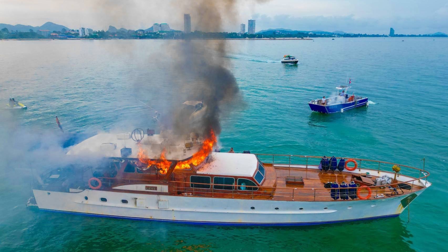 เพลิงโหมลุกไหม้เรือยอร์ชสุดหรูอายุเกือบ 100 ปี กลางอ่าวบ้านอำเภอ อ.สัตหีบ จ.ชลบุรี เจ้าหน้าที่ระดมเรือดับเพลิงสปีดโบ๊ท–เจ็ตสกีช่วยฉีดน้ำควบคุมไฟหวิดวอดทั้งลำ เจ้าของเรือเผยไม่ได้ทำประกัน แต่โชคดีไร้เจ็บ-เสียชีวิต คาดสาเหตุจาก ไฟฟ้าลัดวงจร