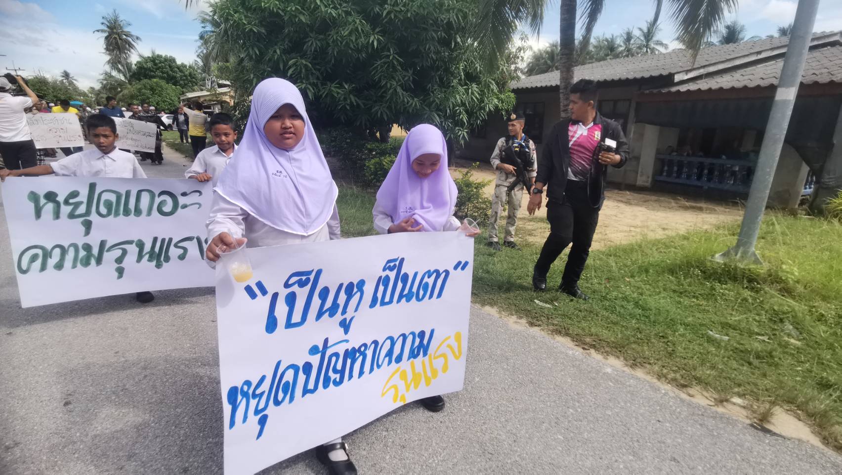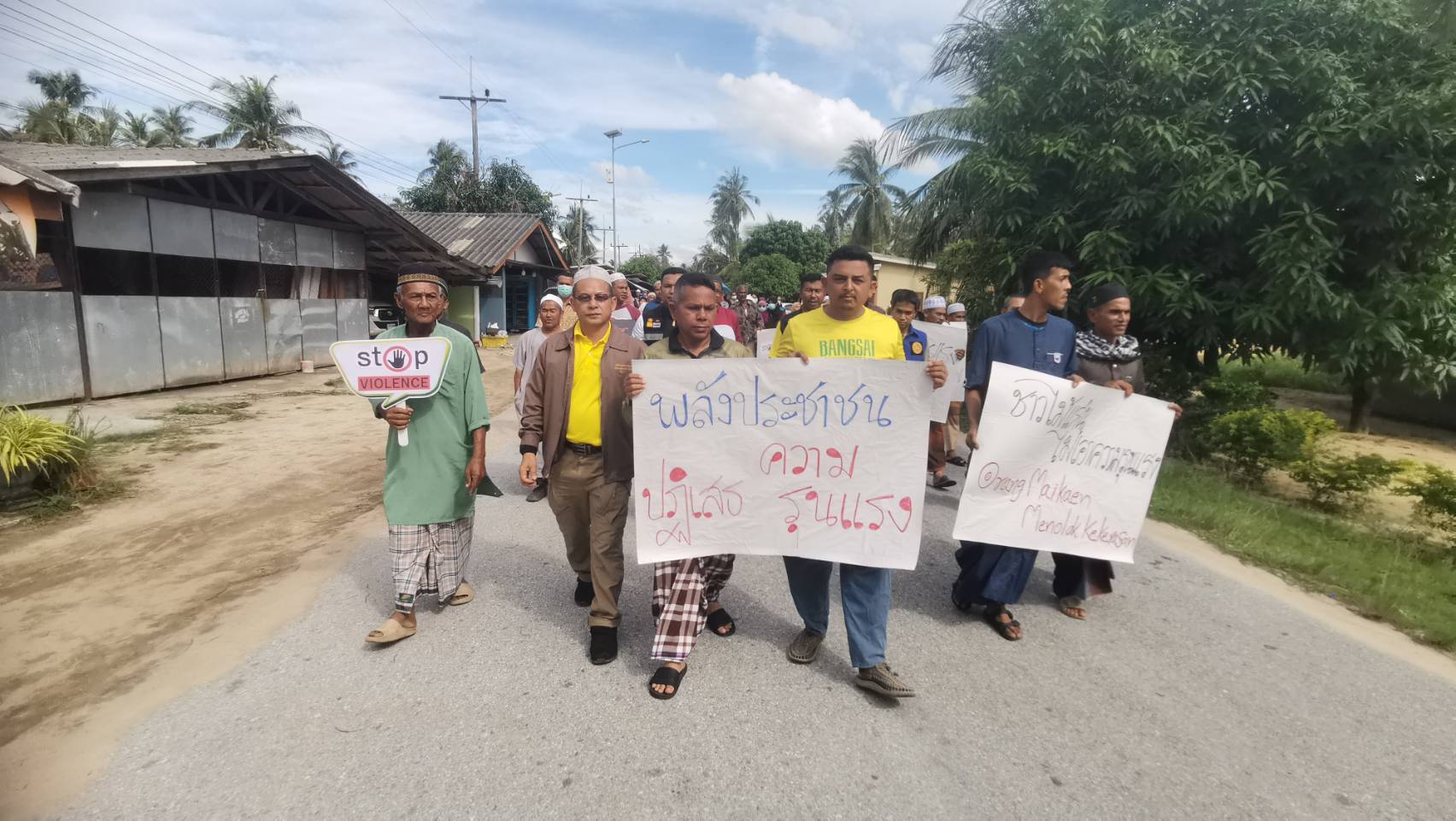 พี่น้องชาวไทยพุทธ-มุสลิม อ.ไม้แก่น 300 คน รวมตัวประท้วง ไม่เอาความรุนแรง หลังเหตุกราดยิง อส. เสียชีวิต