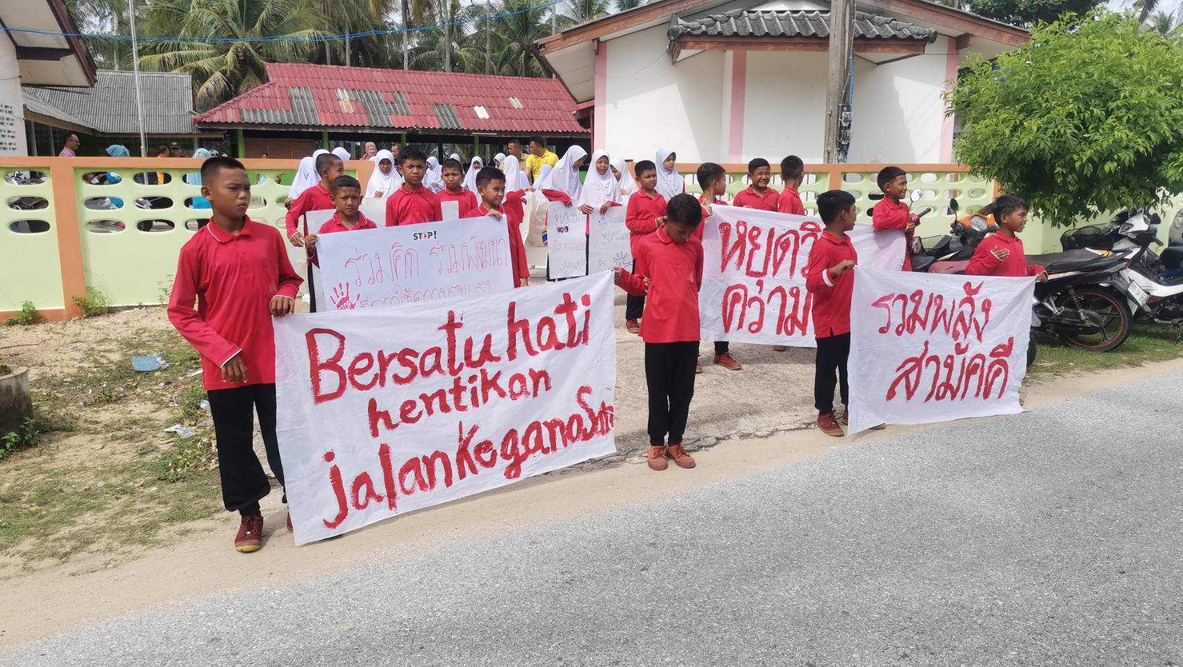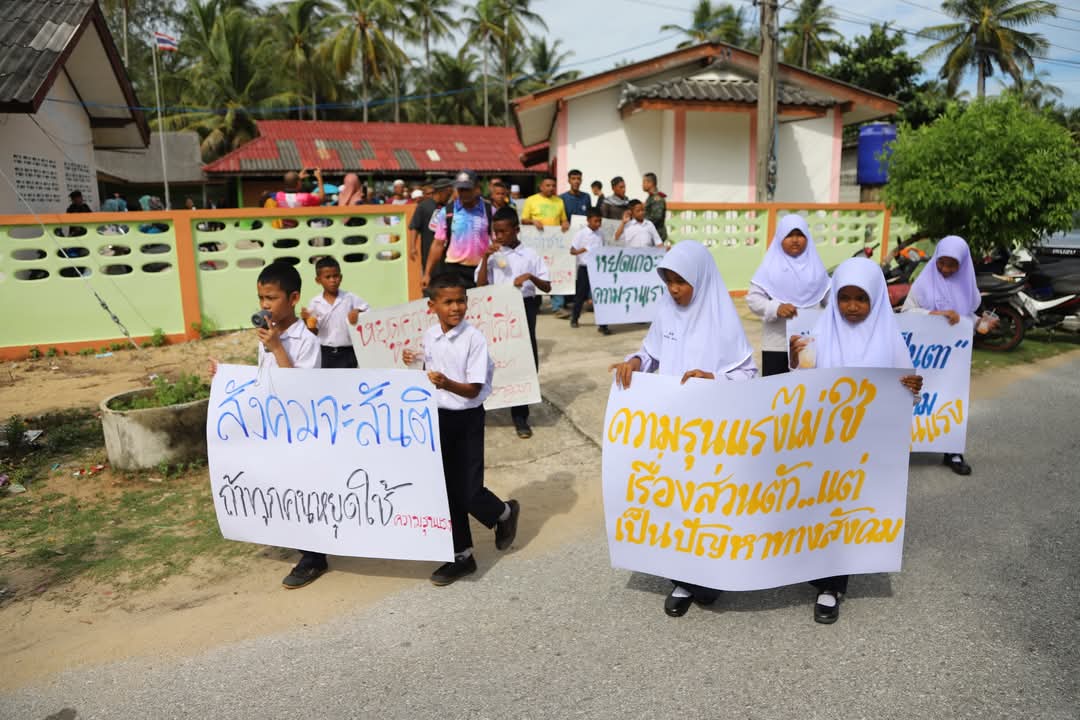 นอกจากนี้ มีชาวบ้านรวมกว่า 300 คน ซึ่งรวมถึงนักเรียนจากโรงเรียนบ้านระเวง ได้รวมตัวกันเดินรณรงค์รอบหมู่บ้าน พร้อมชูป้ายข้อความ เช่น เราไม่ต้องการความรุนแรง, ร่วมคิดร่วมพัฒนาดีกว่าใช้ความรุนแรง, หยุดความรุนแรง, และ เป็นหูเป็นตาหยุดปัญหาความรุนแรง โดยมีการตะโกนคำว่า เราไม่เอาความรุนแรง ไปตลอดเส้นทาง หลังเสร็จสิ้นกิจกรรม ผู้นำศาสนาและชาวบ้านได้ร่วมกันละหมาด ขอพรให้หมู่บ้านและพื้นที่กลับคืนสู่ความสงบโดยเร็ว