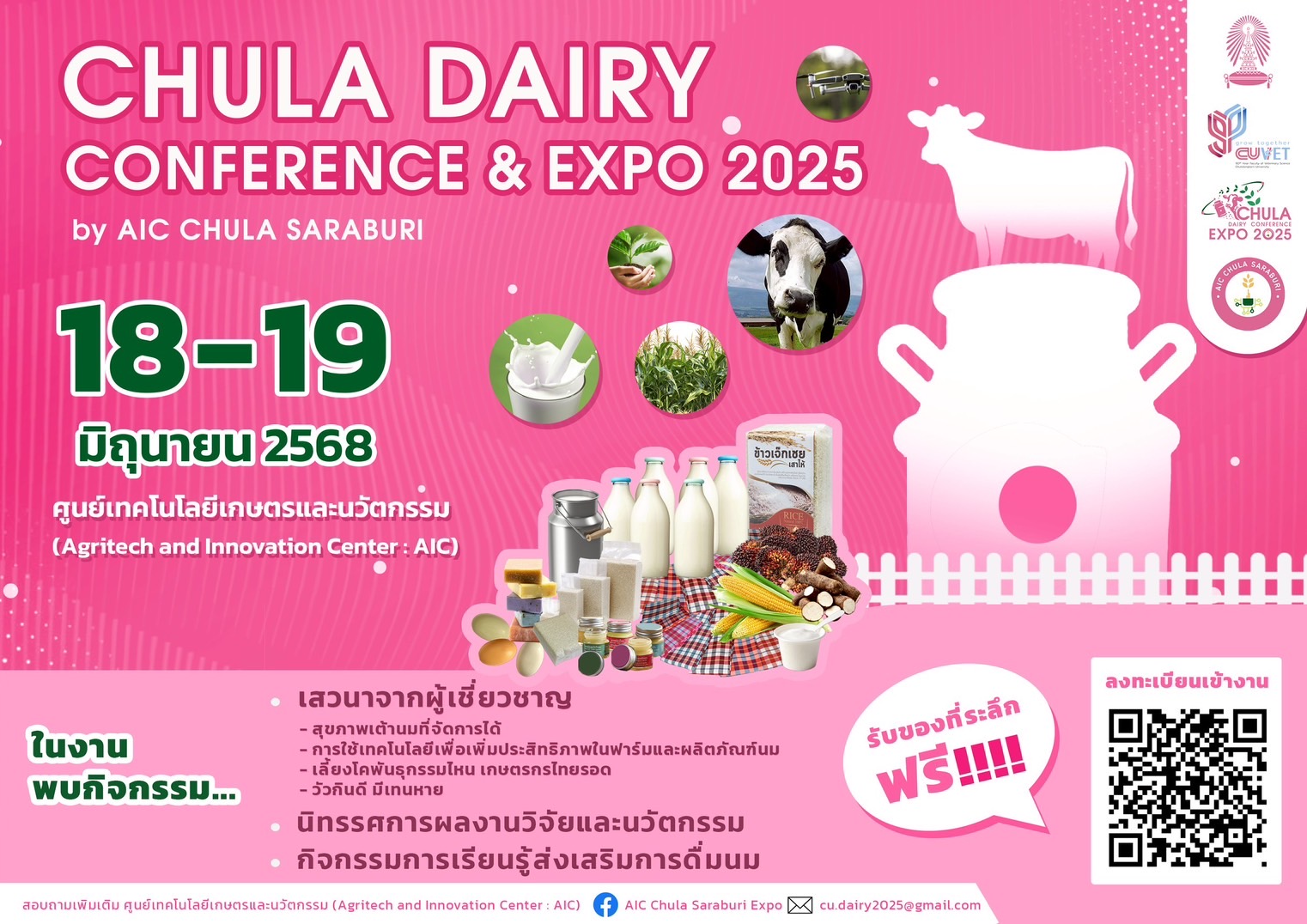 ศูนย์เทคโนโลยีเกษตรและนวัตกรรม จ.สระบุรี จับมือ คณะสัตวแพทยศาสตร์ จุฬาฯ จัดงาน “Chula Dairy Conference and Expo 2025 by AIC Chula Saraburi” 18-19 มิถุนายน 2568 นี้ พบนิทรรศการอุตสาหกรรมโคนมไทย อัพเดทเทรนด์ใหม่ๆสร้างเครือข่ายวงการโคนม