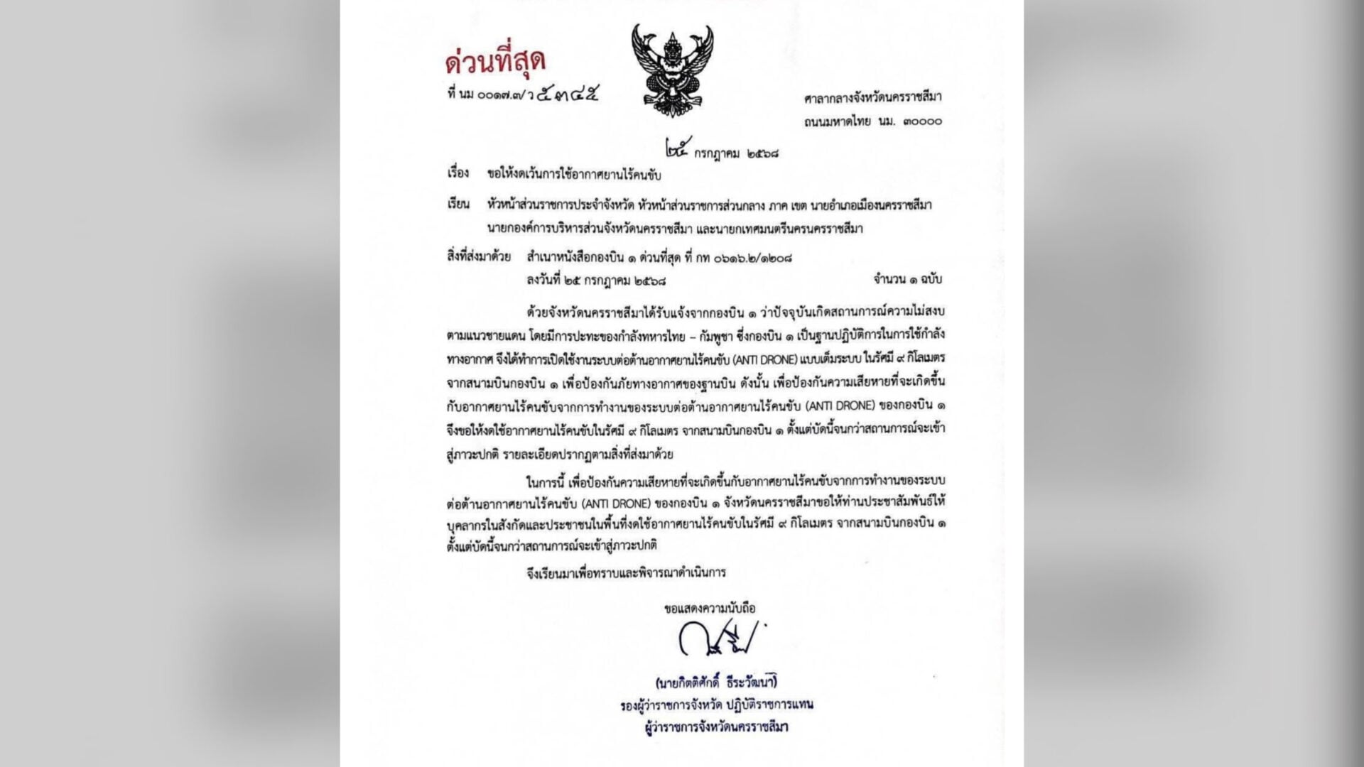 รองผู้ว่าราชการจังหวัดนครราชสีมา ปฏิบัติราชการแทนผู้ว่าฯ ออกหนังสือด่วนที่สุดถึงทุกหน่วยงาน ขอความร่วมมือหยุดใช้อากาศยานไร้คนขับรอบกองบิน 1 เพื่อป้องกันอันตรายต่อการบิน พร้อมเปิดระบบ ANTI DRONE มีผลตั้งแต่ 25 ก.ค. เป็นต้นไป