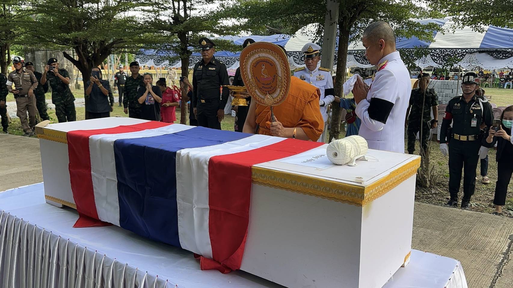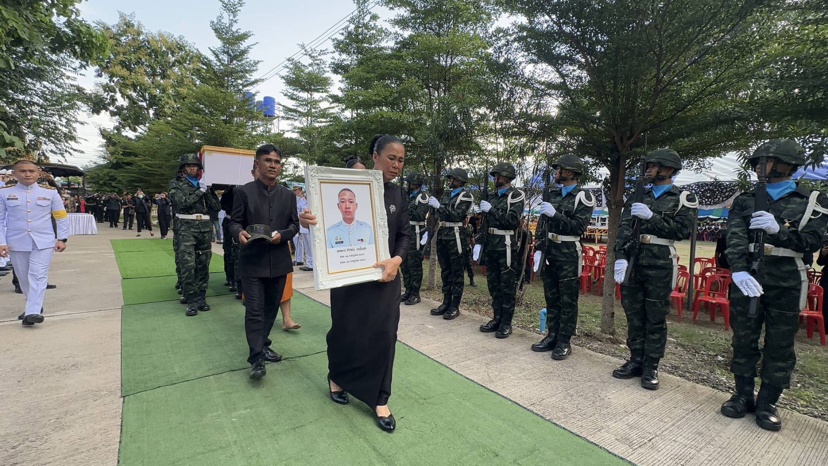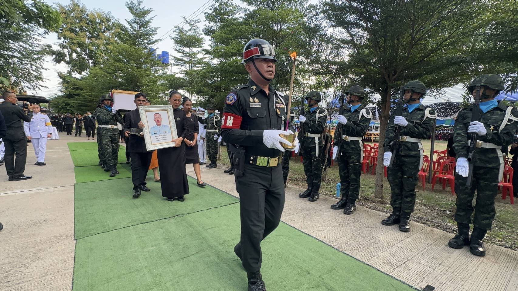 เสียงสะอื้นดังท่ามกลางธงชาติที่โบกสะบัด “พลทหารสิรวิชญ์” วีรบุรุษแนวรบกลับถึงบ้านเกิด พ่อแม่รับหมวก–รูปถ่ายลูกชายแน่นอก ขบวนทหารตั้งแถวเกียรติยศ ก่อนเข้าสู่พิธีพระราชทานน้ำหลวง