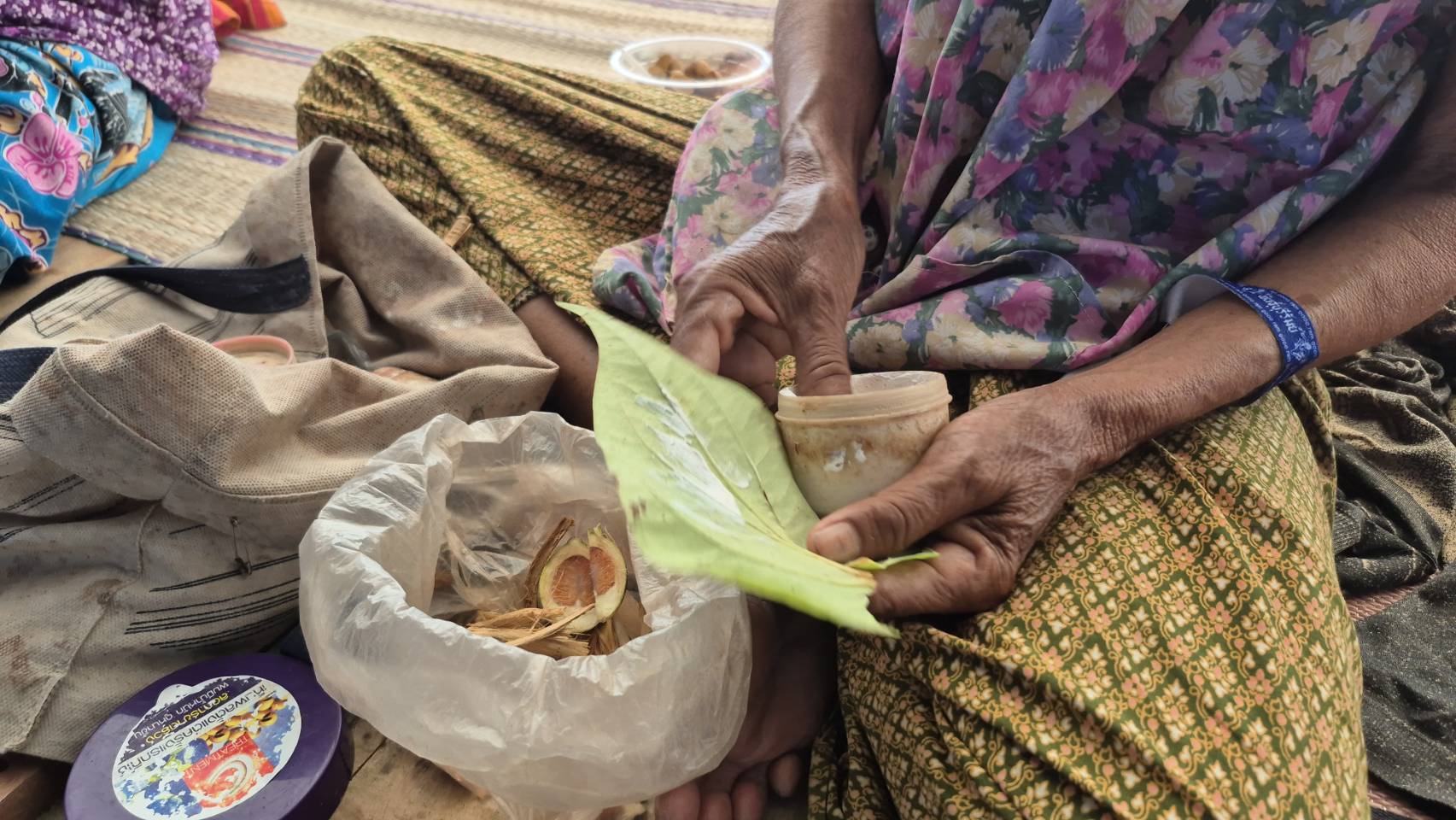 คุณยายบุญ และคุณยายหน่อย ระบุว่า ปกติอยู่ที่บ้านก็จะต้องเคี้ยวหมากทุกวัน โดยเฉพาะหลังรับประทานอาหาร และยามว่าง เพราะการเคี้ยวหมากนอกจากจะช่วยดับกลิ่นปากแล้ว ยังทำให้รู้สึกผ่อนคลายด้วย ซึ่งหลังจากต้องหนีการสู้รบกันที่ชายแดนไทย-กัมพูชา มาอาศัยที่ศูนย์พักพิง นอกจากจะต้องเอาเสื้อผ้า และเอกสารสำคัญติดตัวมาแล้ว สิ่งที่ขาดไม่ได้คือตะกร้าหมาก และอุปกรณ์การเคี้ยวหมาก เพราะหากไม่ได้เคี้ยวหมากก็คงจะเครียดและหงุดหงิด