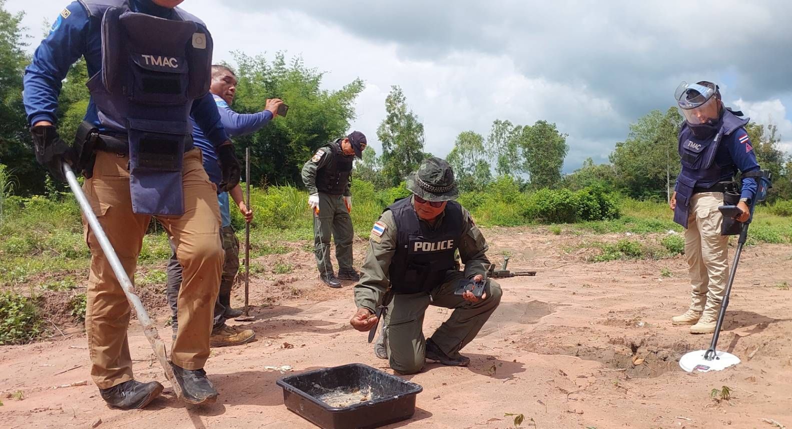 13 สิงหาคม 2568 - ผู้สื่อข่าวรายงานว่า เจ้าหน้าที่หน่วยปฏิบัติการทุ่นระเบิดด้านมนุษยธรรมที่ 3 ศูนย์ปฏิบัติการทุ่นระเบิดแห่งชาติ (TMAC) ศูนย์บัญชาการทางทหาร กองบัญชาการกองทัพไทย ยังคงปฎิบัติหน้าที่ร่วมกับ หน่วยเก็บกู้วัตถุระเบิด (EOD)กองกำกับการสืบสวน ตำรวจภูธรจังหวัดบุรีรัมย์ (EOD กก.สืบสวน ภ.จว.บุรีรัมย์) ออกทำการสำรวจเพื่อพิสูจน์ทราบ เก็บกู้ และทำลายสรรพาวุธระเบิด ในพื้นที่ที่ได้รับผลกระทบจากการโจมตีของฝ่ายกัมพูชา ที่ถูกยิงตกลงมาในพื้นที่ อ.บ้านกรวด จ.บุรีรัมย์