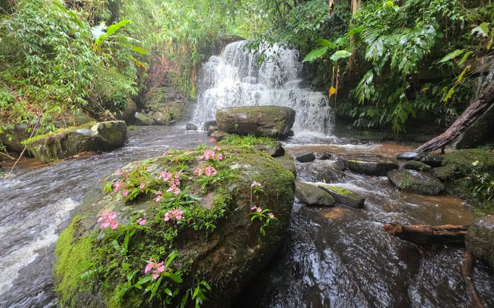 14 สิงหาคม 2568 - ผู้สื่อข่าวรายงานว่า ในช่วงเดือนสิงหาคมของทุกปี และเป็นช่วงฤดูฝน นักท่องเที่ยวเดินป่าชมน้ำตกหมันแดง ใจกลางอุทยานแห่งชาติภูหินร่องกล้า ที่กำลังสวยงาม ทั้ง 9 ชั้น จะสวยงดงามแตกต่างกัน ไป โดยเฉพาะชั้นที่ 5 ของน้ำตกหมันแดง ในช่วงนี้ ดอกลิ้นมังกร สีชมพู เพชรเม็ดงาม ที่ออกปีที่ละ 1 ครั้ง กำลังออกดอกสวยงาม ให้นักท่องเที่ยวได้มายลโฉม บริเวณหน้าน้ำตก ทำให้นักท่องเที่ยวต่างถ่ายภาพดอกลิ้นมังกร มีม่านน้ำตกเป็นแบลคกราว