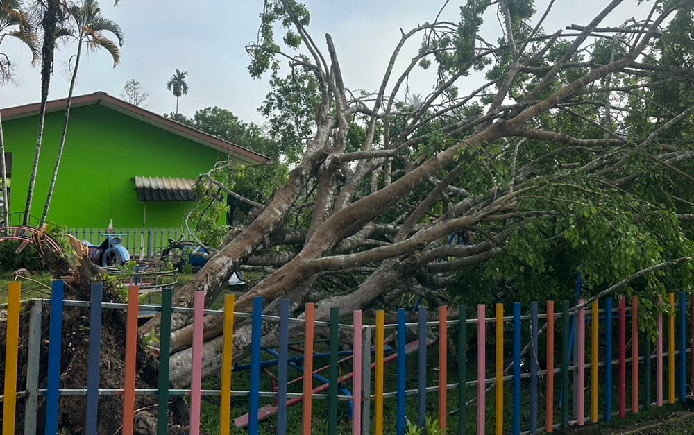 21 สิงหาคม 2568 - ที่โรงเรียนบ้านธารมะลิ ม.4 ต.อัยเยอร์เวง อ.เบตง จ.ยะลา หลังจากที่โรงเรียนเลิกนางสาวโสพิส หอมรส ผู้อำนวยการโรงเรียน คุณครู และนักเรียน ได้ช่วยกันทำความสะอาดเก็บเศษหลังคา เศษกิ่งไม้ที่หักหล่นอยู่ที่บริเวณสนามเด็กเล่นและบริเวณรอบของโรงเรียน หลังจากที่โดนพายุฝนพัดทำให้ต้นไม้ขนาดใหญ่หลายต้นหักโค่นล้มลงมา และทำให้หลังคาอาคารเรียน หลังคาบ้านพักครูถูกลมพัดปลิวว่อน ได้รับความเสียหาย จนทำให้คุณครู ต้องอาศัยห้องเรียนอนุบาลเป็นที่หลับนอนชั่วคราว เมื่อช่วงคืนวันที่ 18 สิงหาคมที่ผ่านมา