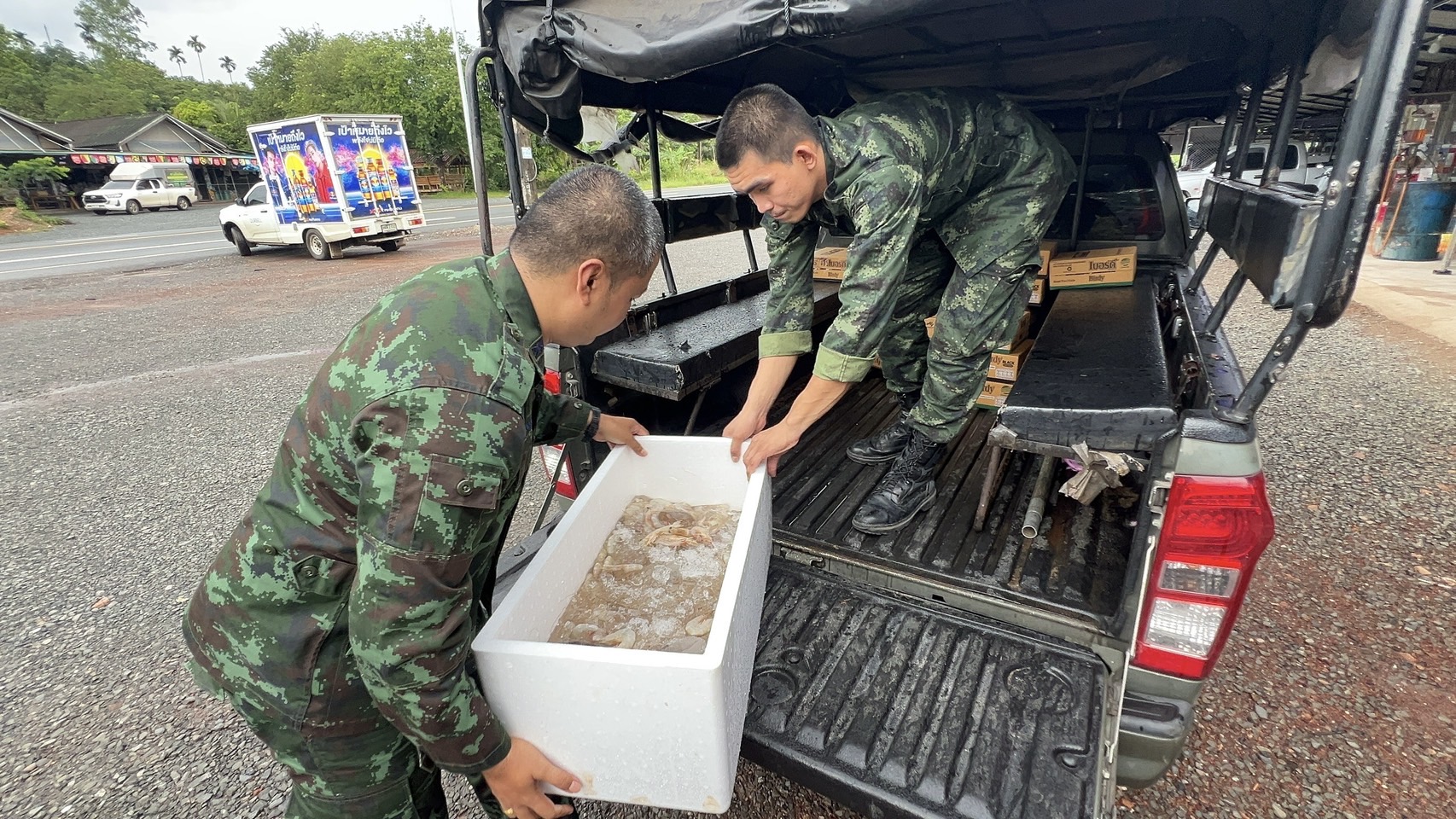นางธนาพร ยังกล่าวขอบคุณทหารแนวหน้า ที่ทำให้พวกเรายังยืนอยู่ตรงนี้ได้ ความลำบากของพวกเขา ทำให้เรายังสามารถทำมาหากินในบ้านของเราได้เหมือนเดิม ถ้าไม่มีพวกเขา เราก็อยู่ไม่ได้จริงๆ น้ำใจเล็กๆ น้อยๆ นี้จึงเป็นสิ่งที่พวกเราอยากมอบให้จากใจจริง ส่วนนางสาวรสวรรณ โชติเสวตร์ เกษตรกรสวนทุเรียน อำเภอแหลมงอบ จังหวัดตราด นำกุ้งทะเลกว่า 20 กิโลกรัม มามอบให้กับทหารและตำรวจ ตชด.ที่ยังคงตรึงกำลังพื้นที่ชายแดน เพื่อเป็นขวัญกำลังใจให้กับแนวหน้าที่กำลังปฏิบัติหน้าที่ .