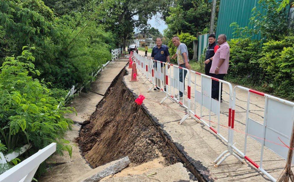 ฝนตกหนักสะสมน้ำเซาะดินสไลด์ ถนนคอนกรีตเสริมเหล็กที่บุรีรัมย์ ทรุดพังลึก 3 เมตร ยาว 40 เมตร นายกเทศมนตรีเมืองชุมเห็ด นำทีมกองช่างรุดตรวจสอบความเสียหาย ใช้แผงเหล็กกั้นห้ามรถหนักสัญจรหวั่นอันตราย เตรียมเสนอสภาขอใช้งบจ่ายขาดเงินสะสมเร่งซ่อมให้ ปชช.สัญจรได้อย่างปลอดภัย