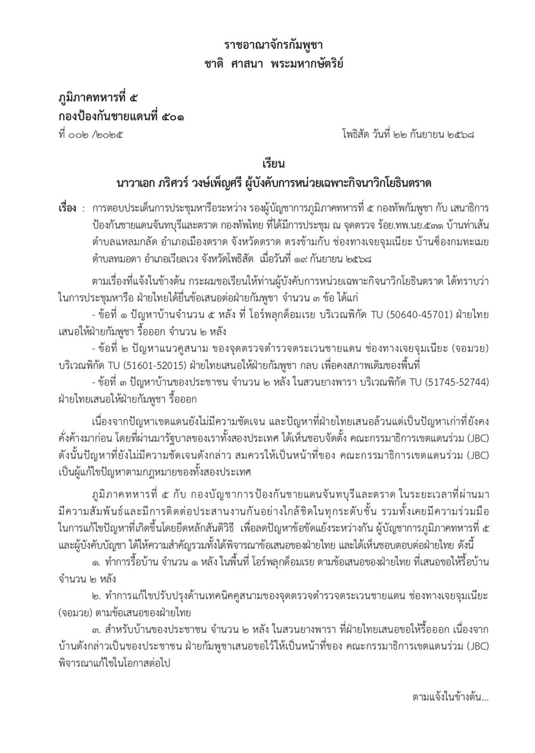 โดยระบุให้เป็นหน้าที่ของคณะกรรมาธิการเขตแดนร่วม (JBC) ในการพิจารณา โดยเอกสารดังกล่าว ลงวันที่ 22 กันยายน 2568 และลงนามโดย พันเอก จัน บุนดี ผู้บังคับกองป้องกันชายแดนที่ 501 ภูมิภาคทหารที่ 5 กองทัพกัมพูชา ส่งถึง นาวาเอก ภริศวร์ วงษ์เพ็ญศรี ผู้บังคับการหน่วยเฉพาะกิจนาวิกโยธินตราด เพื่อตอบประเด็นจากการประชุมหารือระหว่างรองผู้บัญชาการภูมิภาคทหารที่ 5 กัมพูชา และเสนาธิการป้องกันชายแดนจันทบุรีและตราดของไทย ณ จุดตรวจร้อย.ทพ.นย.531 บ้านท่าเส้น จ.ตราด เนื้อหาในหนังสือระบุถึงข้อเสนอ 3 ข้อที่ฝ่ายไทยได้ยื่นต่อฝ่ายกัมพูชา และการพิจารณาตอบกลับของฝ่ายกัมพูชา
