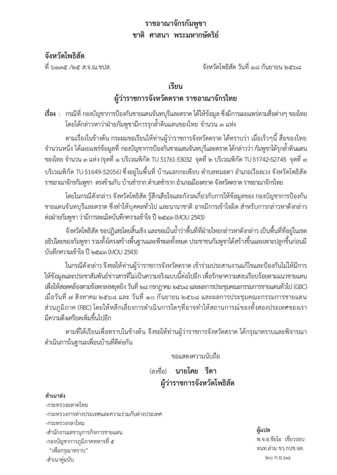 ก่อนหน้านี้ นายโคย รีดา ผู้ว่าราชการจังหวัดโพธิสัตผู้ว่าราชการจังหวัดตราด ราชอาณาจักรไทย ทำหนังสือถึงนายณัฐพงษ์ สงวนจิตร ผู้ว่าราชการจังหวัดตราด เมื่อวันที่ 18 กันยายน 2568 เรื่อง : กรณีที่ กองบัญชาการป้องกันชายแดนจันทบุรีและตราด ได้ให้ข้อมูล ซึ่งมีการเผยแพร่ตามสื่อต่างๆ ของไทยโดยได้กล่าวหาว่าฝ่ายกัมพูชามีการรุกล้ำดินแดนของไทย จำนวน 3 แห่ง