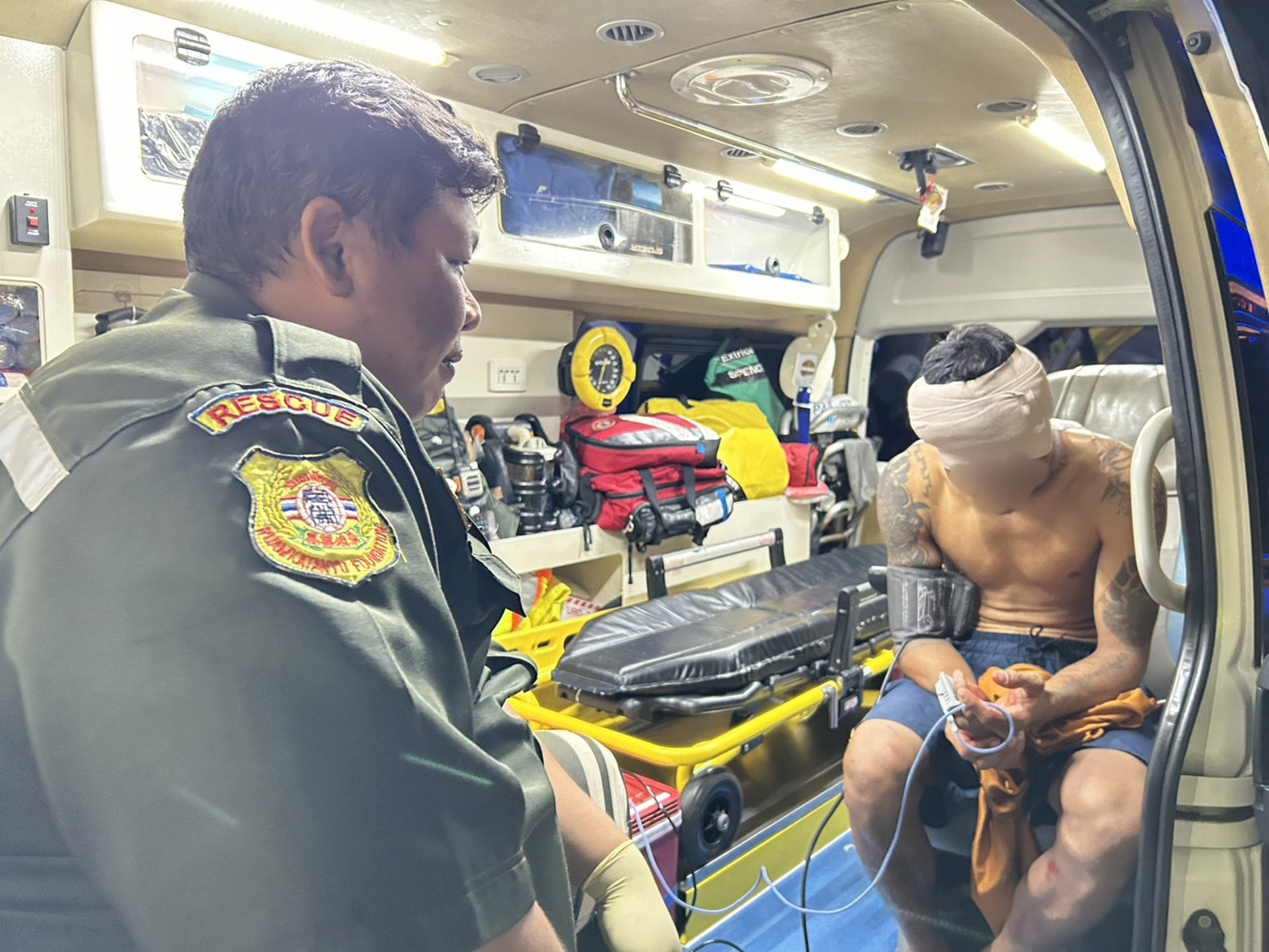 ที่เกิดเหตุ ที่หน้าห้องพักแคมป์คนงาน พบนายทราย อายุ 31 ปี ชาวเมียนมา อยู่ในอาการเมาสุรา ถูกมีดฟันที่ศีรษะด้านหน้าแผลฉกรรจ์ และที่หลังอีกแผลเลือดไหลอาบ เจ้าหน้าที่มูลนิธิร่วมกตัญญูปฐมพยาบาลเบื้องต้น และนำส่งรักษาตัวที่ รพ.บางพลี