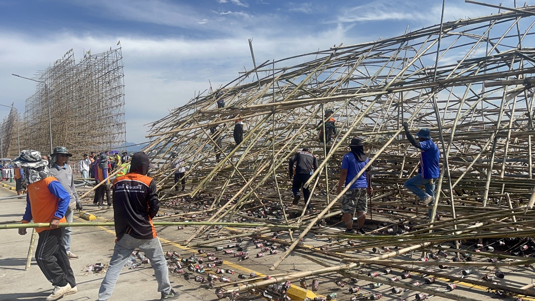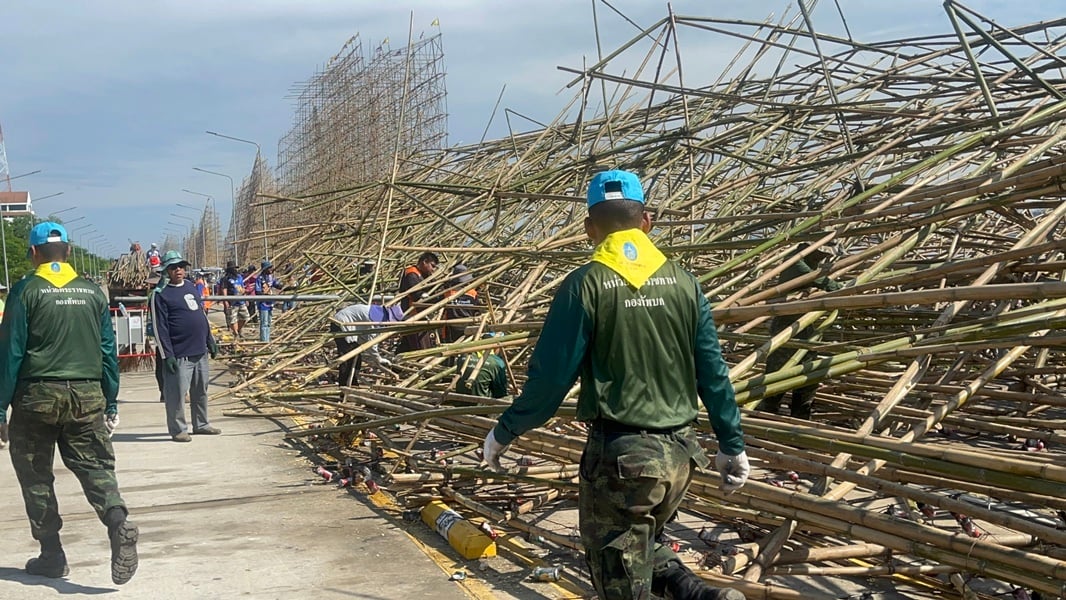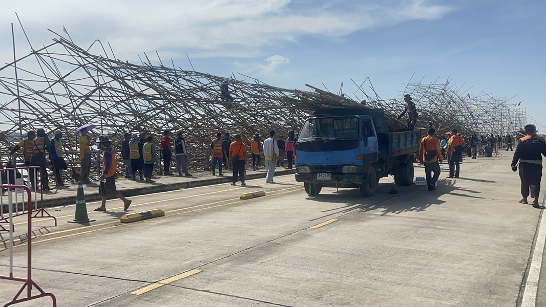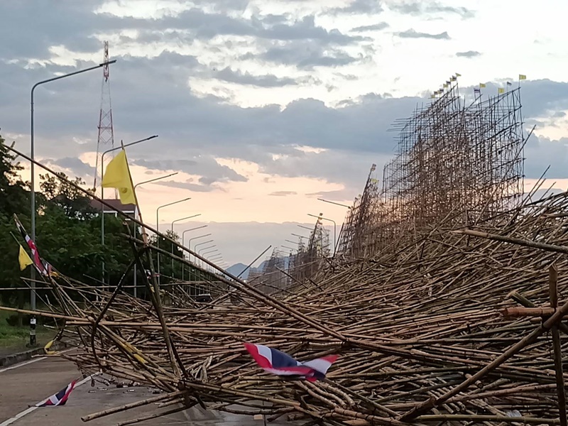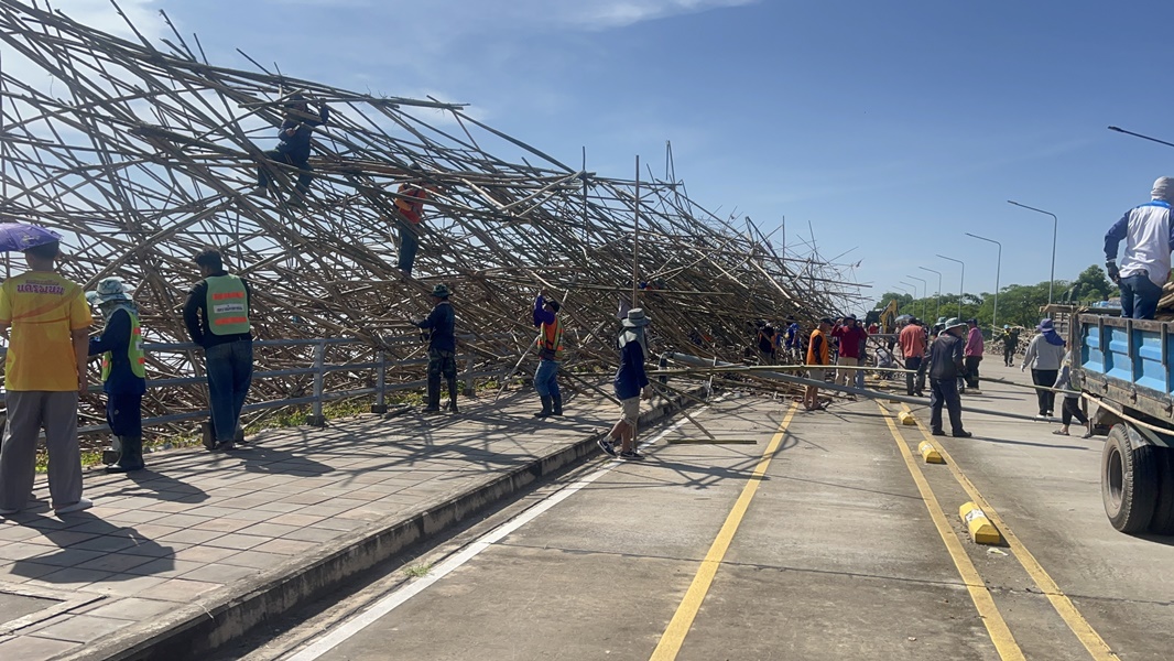 11 ตุลาคม 2568 - ที่ถนนสวรรค์ชายโขงจุดเช็คอินชื่อดังติดริมแม่น้ำโขง เขตเทศบาลเมืองนครพนม ว่าที่ร้อยตรีรวยรุ่ง ใครบุตร รองผู้ว่าราชการจังหวัดนครพนม ได้ระดมทุกสรรพกำลัง เคลียร์เส้นทางบริเวณด้านหลังโรงแรมแม่โขงเฮอริเทจ ซึ่งเป็นจุดที่ซากเรือไฟยักษ์ของอำเภอศรีสงคราม จากอิทธิพลฝนตกฟ้าคะนอง และมีลมกระโชกแรง ซัดโครงสร้างพังครืนทลายทับถนน เมื่อเย็นวันที่ 10 ตุลาคมที่ผ่านมา ทำให้มีรถยนต์เก๋งฝากระโปรงหน้าเสียหายเล็กน้อย 1 คัน และเสาไฟฟ้าส่องสว่างหักรวม 5 ต้น ประเมินมูลค่าต้นละประมาณ 50,000 บาท