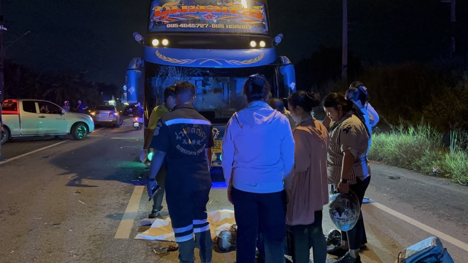 ห่างออกไปพบรถบัสรับ–ส่งพนักงาน หมายเลขทะเบียน 30–2952 สมุทรปราการ ตัวถังด้านหน้าและกระจกแตกเสียหาย และยังมีรถยนต์เก๋งนิสสัน ทะเบียน 2 ขญ 1532 กรุงเทพมหานคร สภาพหน้าขวาพังยับ ไฟหน้าแตก ล้อแม็กซ์บิดงอ