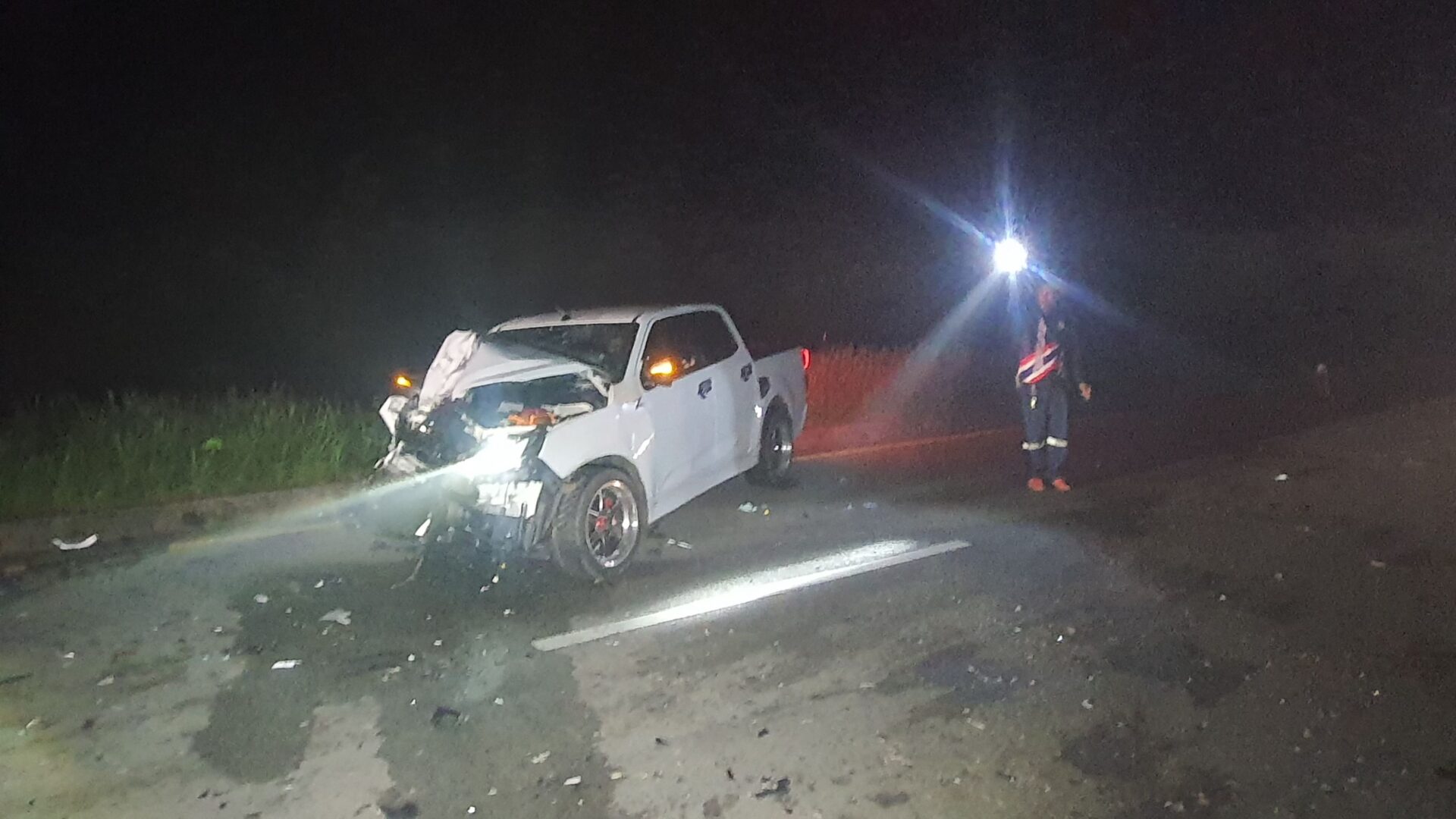 เจ้าห้าที่ตรวจสอบที่เกิดเหตุพบรถยนต์กระบะ ยี่ห้ออีซูซุ สี่ประตูสีขาว หมายเลขทะเบียน กธ1999 ชุมพร สภาพจอดขวางเลนขวาสุดของถนน ส่วนท้ายรถเกยติดอยู่กับเกาะกลางถนน ด้านหน้าของรถพังยับเยิน ลักษณะชนอย่างแรง จนถุงลมนิรภัยทำงาน ทราบชื่อคนขับคือ นายบุญธรรม ภู่จีน อายุ 37 ปี อยู่บ้านเลขที่ 153/1 ม.4 ต.มะมุ อ.กระบุรี จ.ระนอง ถูกแรงกระแทกได้รับบาดเจ็บหนัก หายใจติดขัด เจ้าหน้าที่กู้ชีพกู้ภัยได้เร่งงัดออกมากรถ ก่อนเร่งนำตัวขึ้น รถ ก่อนนำตัวส่ง รพ.ชุมพร อย่างเร่งด่วน