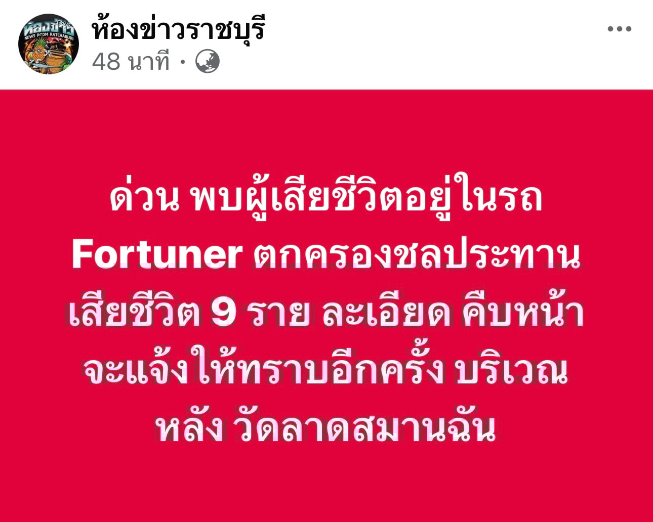 3 ธันวาคม 2568 – เพจเฟซบุ๊ก “ห้องข่าวราชบุรี” รายงานด่วนช่วงเช้าวันนี้ว่าเกิดเหตุสะเทือนขวัญในพื้นที่จังหวัดราชบุรี โดยพบผู้เสียชีวิตจำนวนมากภายในรถยนต์โตโยต้า ฟอร์จูนเนอร์ ซึ่งตกลงไปในคลองชลประทาน หลังวัดราษฎร์สมานฉันท์ ตำบลหนองกระทุ่ม อำเภอปากท่อ