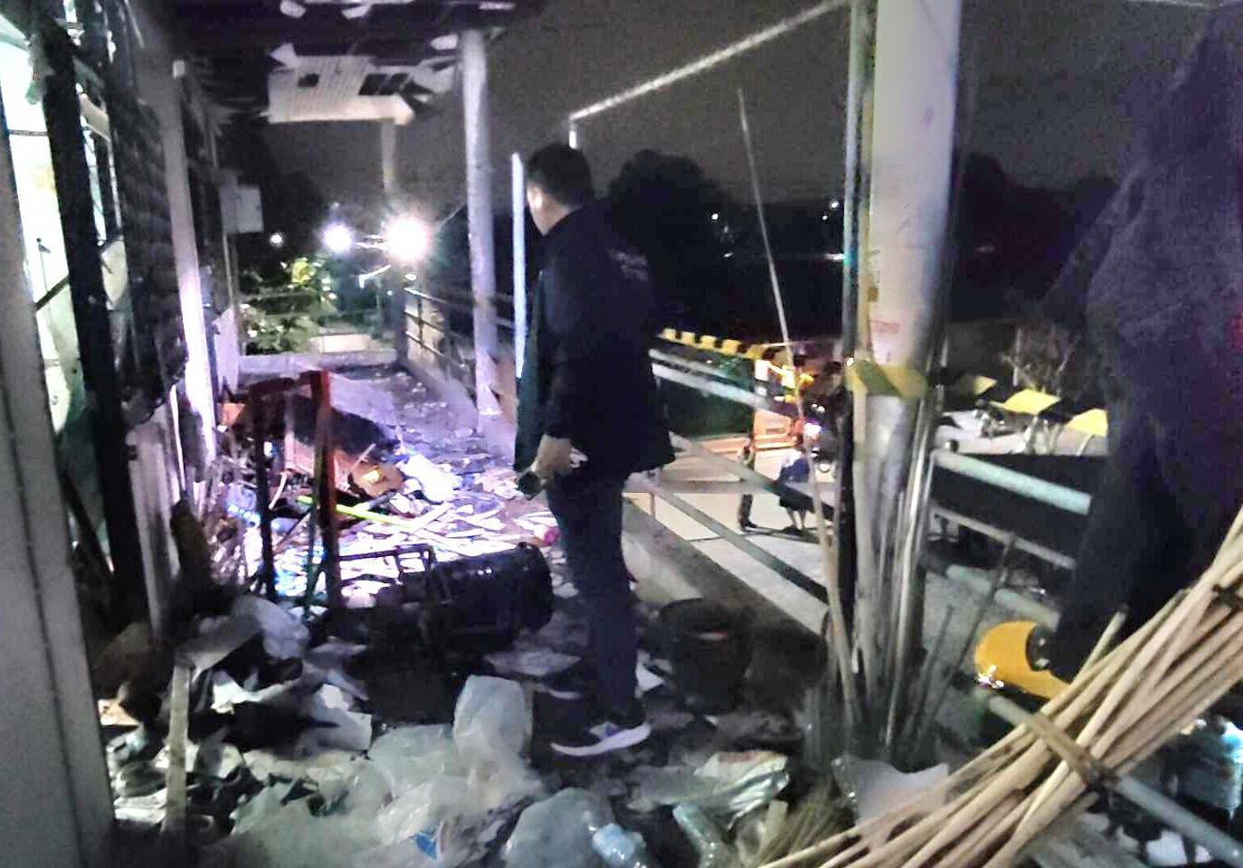 ที่เกิดเหตุมีลักษณะเป็นห้องเช่า 2 ชั้น ซึ่งห้องที่เกิดพลุระเบิด พบข้าวของกระจัดกระจายระนเระนาดจากแรงระเบิดของพลุ และจากการตรวจหลักฐาน พบวัตถุและวัสดุอุปกรณ์ที่ใช้เป็นส่วนของการผลิตพลุ หรือดอกไม้เพลิงที่ใช้จุดแล้วทำให้เกิดเสียงดัง “วี๊ด ปัง” ในช่วงเทศกาลต่างๆ ซึ่งก็มีทั้ง ท่อพีวีชี ดินประสิว แท่งไม้ยาวจำนวนมาก และ อุปกรณ์ที่ใช้เป็นแท่นรองการประกอบพลุ ส่วนในห้องพักนั้น ข้าวของทั้งหมดพังเป็นซาก อีกทั้งยังพบพลุที่อัดเป็นแท่งสำเร็จแล้ว รอการส่งขายอีกจำนวนมาก นอกจากนี้ยังมีฝ้าเพดาน ไฟ และกระจกแตกกระจายไปทั่วบริเวณ รวมถึงกระจกของห้องข้างเคียง และห้องชั้นล่างที่อยู่ฝั่งเดียวกัน ก็ถูกแรงอัดและแรงสั่นสะเทือนได้รับความเสียหายแตกไปตามๆ นับ10 ห้อง