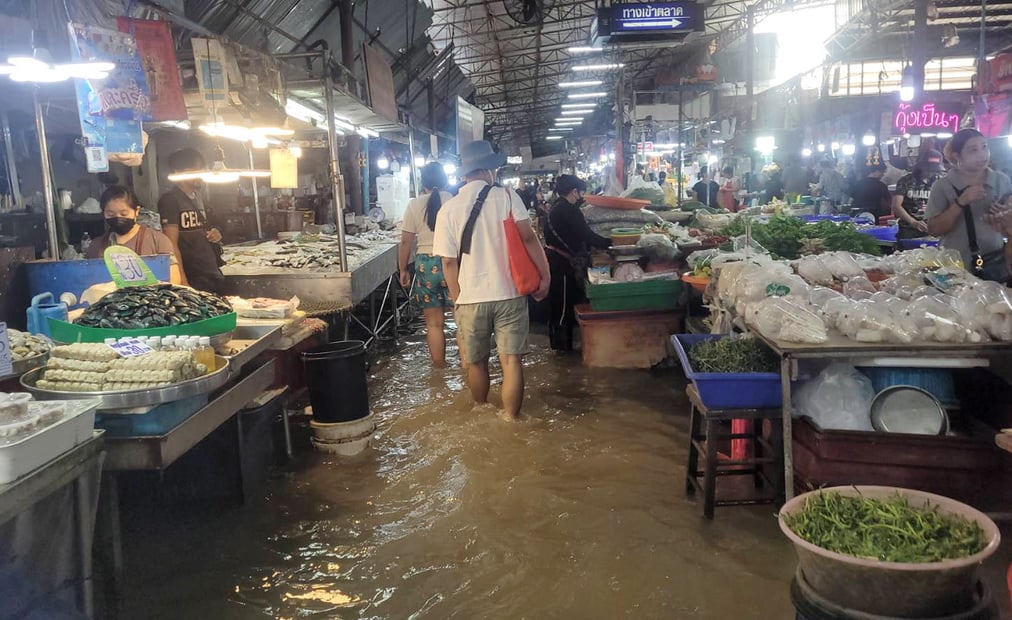 ส่วนบรรยากาศภายใน ตลาดปากน้ำ จังหวัดสมุทรปราการ หลังระดับน้ำทะเลหนุนสูงนั้น ส่งผลให้น้ำเอ่อเข้าท่วมภายในตลาดสด ระดับ 10-15 เซนติเมตร ประมาณข้อเท้า หน้าแข้ง พ่อค้าแม่ค้าต้องลุยน้ำขายของ ขณะที่ลูกค้ายังคงเดินเลือกซื้อสินค้าท่ามกลางน้ำที่ท่วมพื้นตลาด