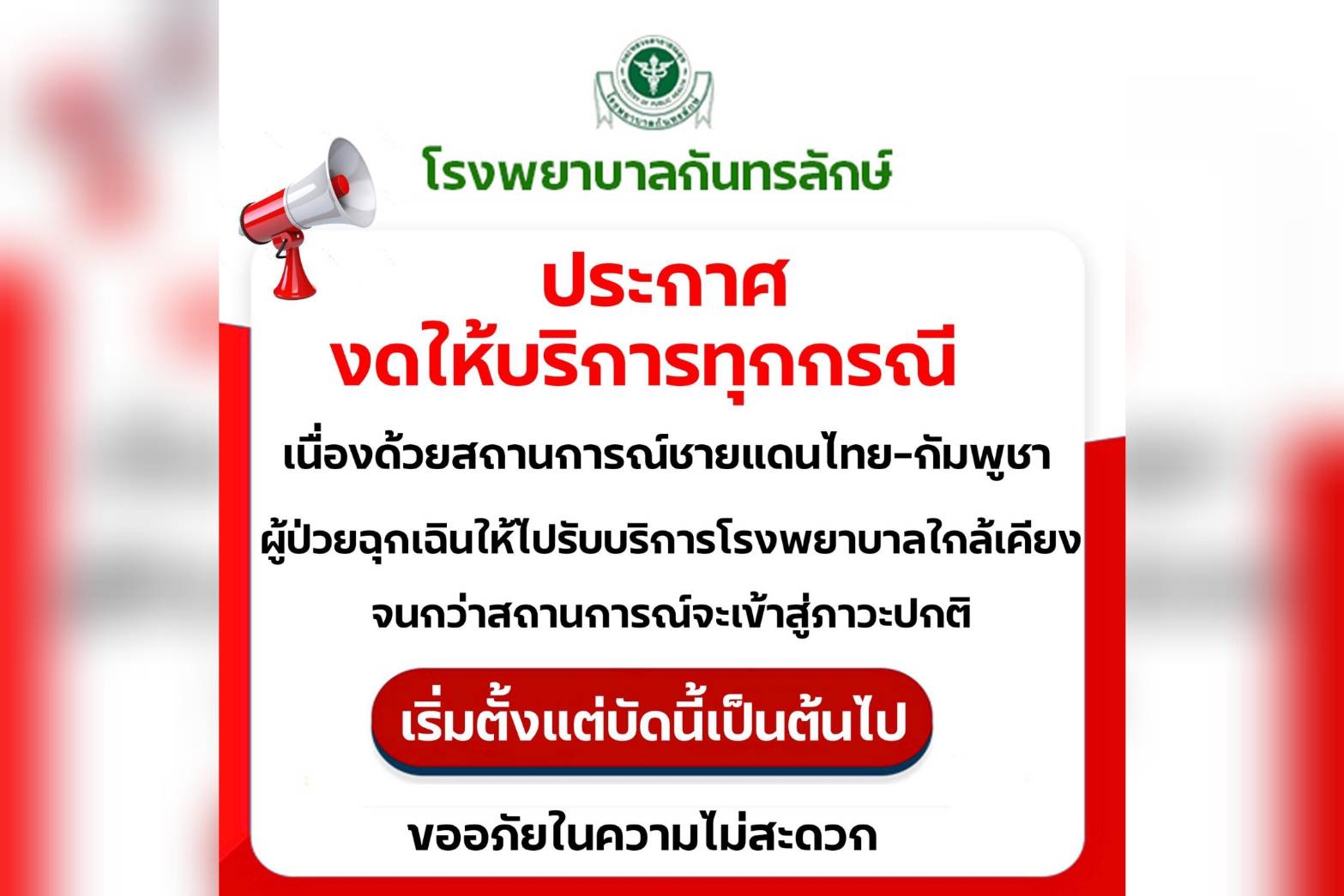 8 ธ.ค.2568-เพจโรงพยาบาลกันทรลักษ์ จ.ศรีสะเกษ แจ้งประกาศงดให้บริการทุกกรณี ระบุว่า เนื่องด้วยสถานการณ์ไทย-กัมพูชา ผู้ป่วยฉุกเฉินให้ไปรับบริการโรงพยาบาลใกล้เคียง จนกว่าสถานการณ์จะเข้าสู่สภาวะปกติ เริ่มตั้งแต่บัดนี้เป็นต้นไป