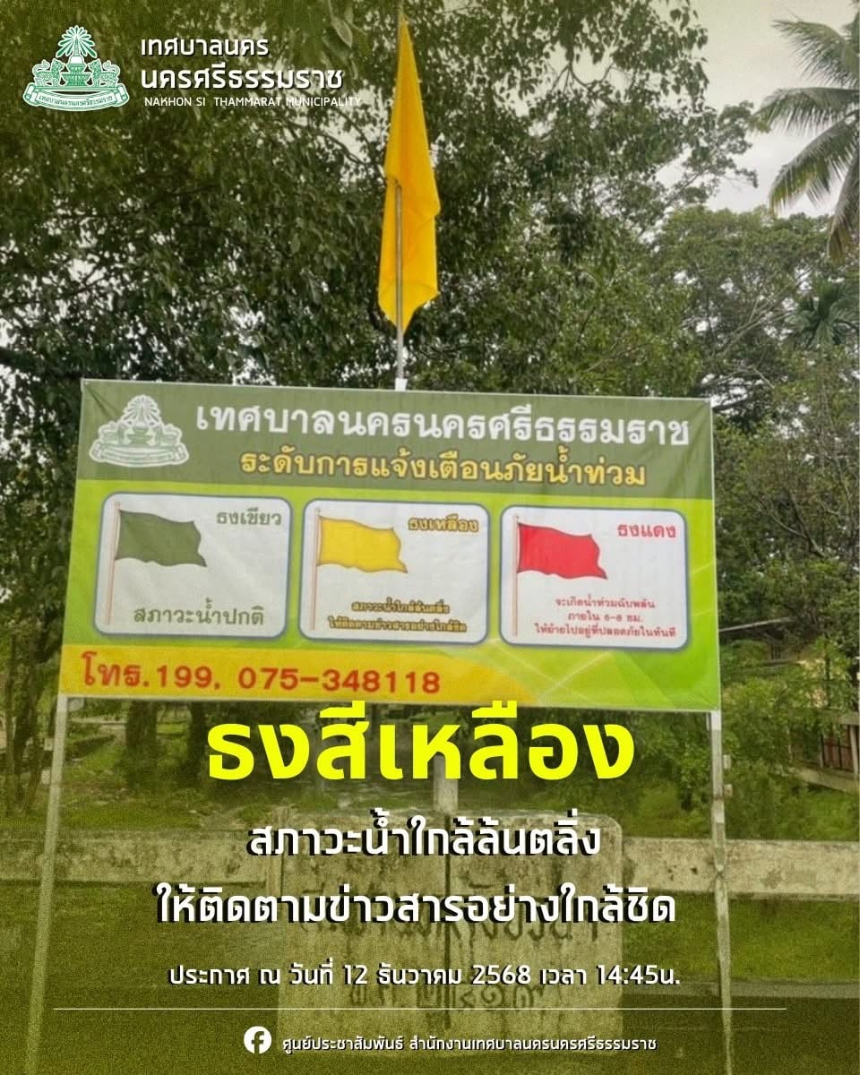 12 ธันวาคม 2568 - เวลา14.45 น. เทศบาลนครนครศรีธรรมราช ภายใต้การนำของ ดร.กณพ เกตุชาติ นายกเทศมนตรีนครนครศรีธรรมราช ได้ดำเนินการติดตั้งป้ายและปักธงสัญลักษณ์แจ้งเตือนภัยบริเวณสะพานข้ามคลองในเขตเทศบาล เพื่อให้ประชาชนรับทราบสถานการณ์และเตรียมพร้อมป้องกันน้ำท่วมและน้ำล้นตลิ่ง