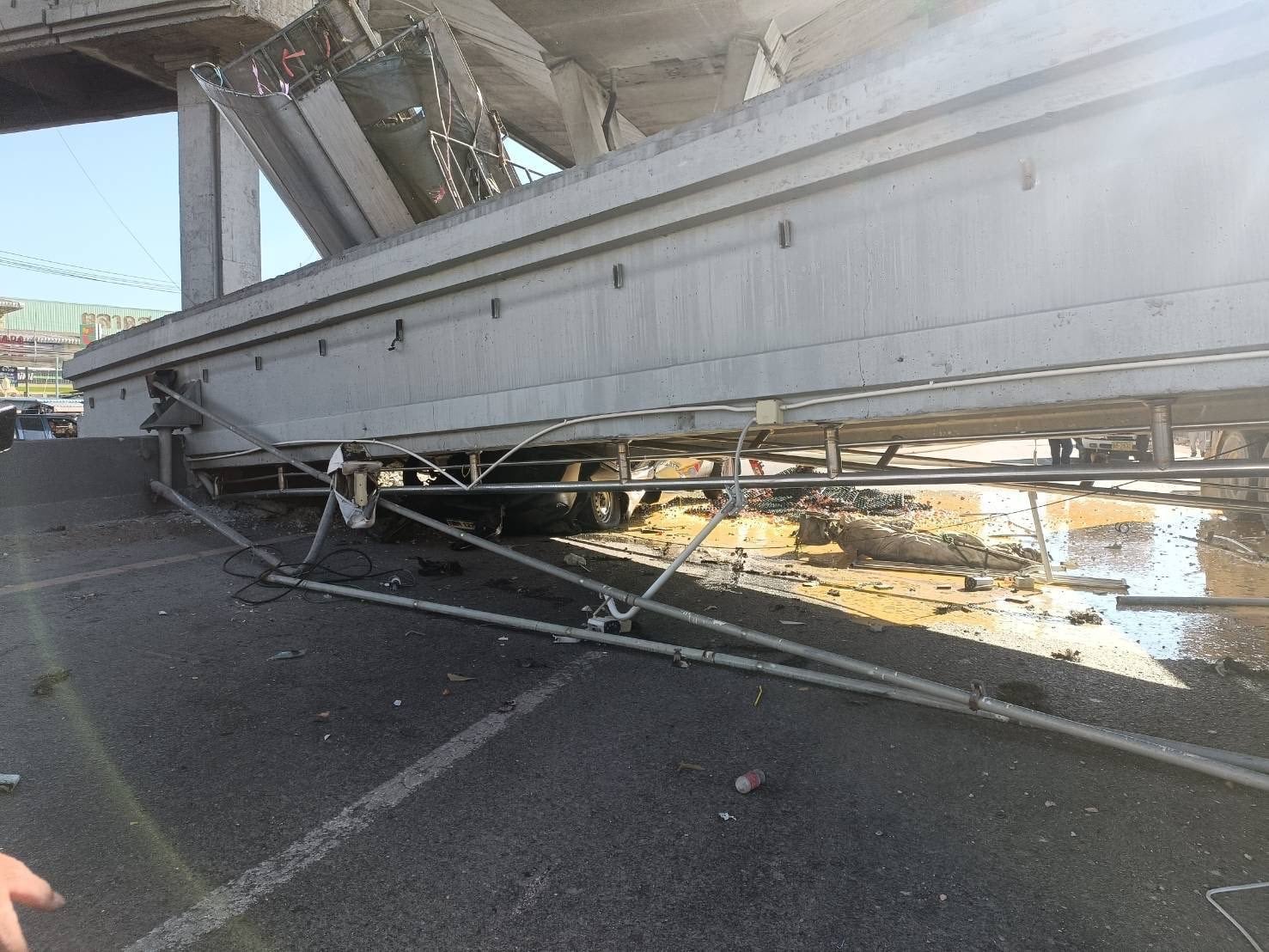 ด้านเพจเฟซบุ๊ก FM91 Trafficpro รายงานว่า เวลา 09.15 น. ติดขัดมาก! ถนนเทพรัตน (บางนา-ตราด) ขาเข้า ช่องทางหลัก รถบรรทุกดั๊มพ์ฟาดสะพานลอยคนข้ามถล่มลงมา ทับหัวรถบรรทุก และรถกระบะ กีดขวางช่องทางหลักช่วงขาเข้า มีผู้บาดเจ็บ 3 รายติดภายใน กู้ภัยเร่งช่วยเหลือภาพจากเพจ Fire & Rescue Thailandภาพจากเพจ FM91 Trafficpro