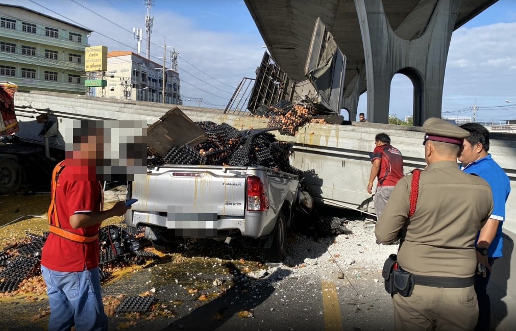 ด่วน! สะพานลอยถล่ม ถ.บางนาตราด หล่นทับรถ กู้ภัยเร่งช่วยคนติดด้านใน