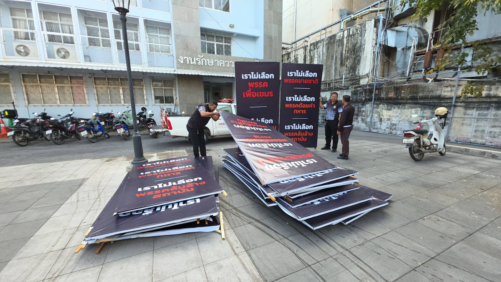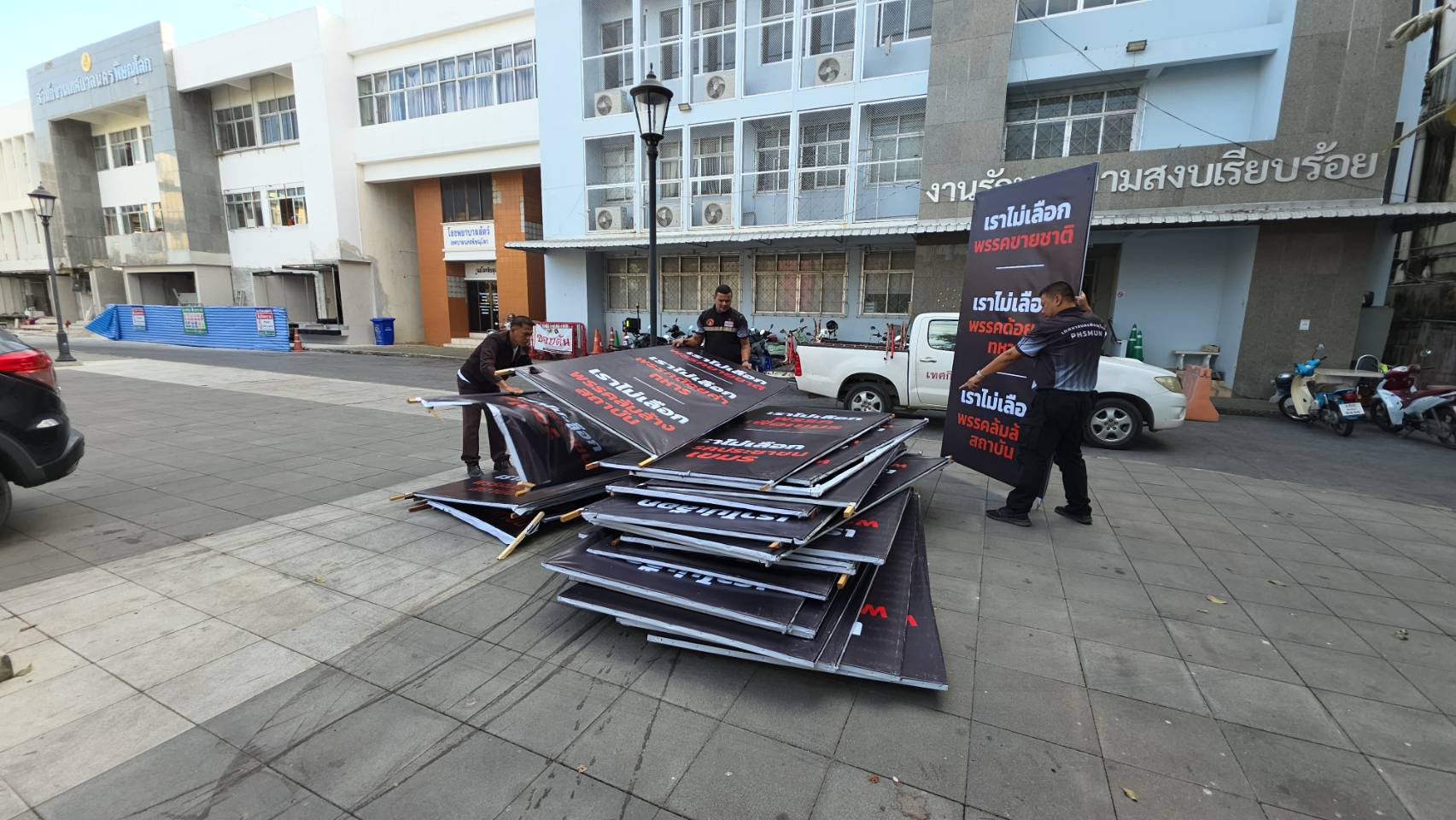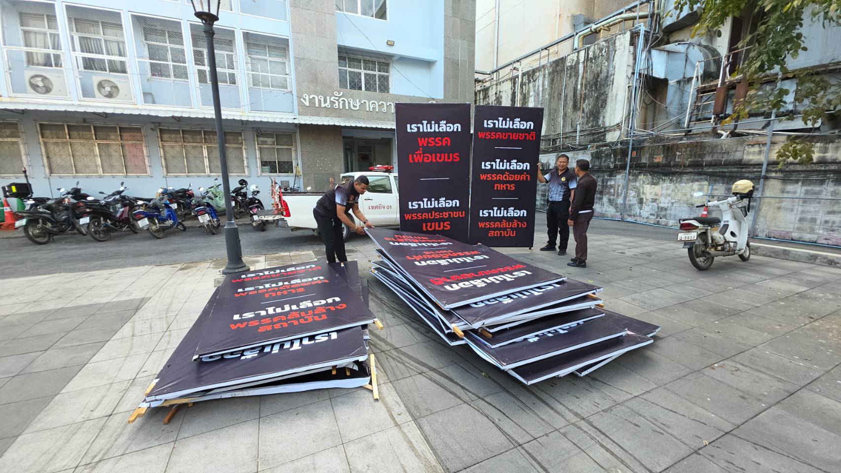 เทศกิจ เทศบาลตำบลหัวรอ และ เทศบาลเมืองท่าโพธิ์ พื้นที่เขตเลือกตั้งที่ 1 จ.พิษณุโลก เร่งเก็บป้ายโจมตี "เราไม่เลือกพรรคขายชาติ เราไม่เลือกพรรคด้อยค่าทหาร เราไม่เลือกพรรคล้มสถาบัน เราไม่เลือกพรรคเพื่อเขมร เราไม่เลือกพรรคประชาชนเขมร" เพิ่มอีกวันนี้ 42 ป้าย ผิด พ.ร.บ.ความสะอาด