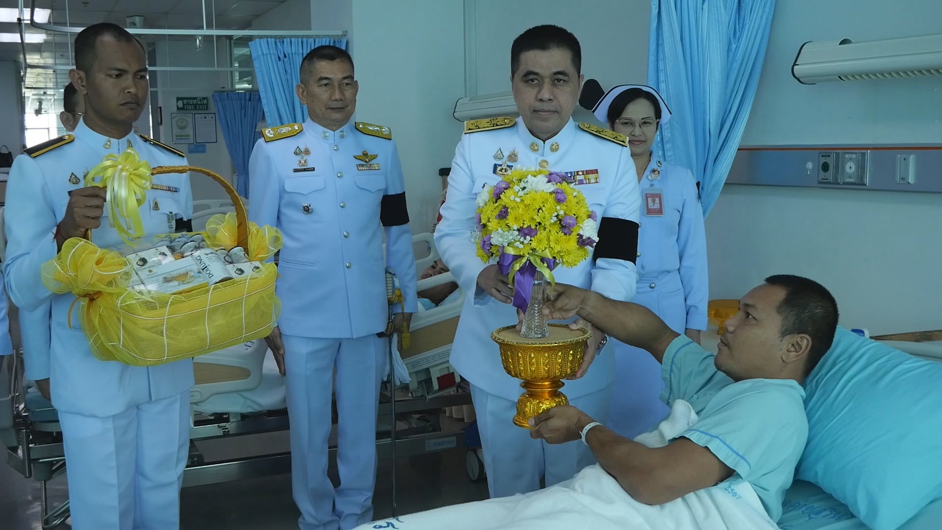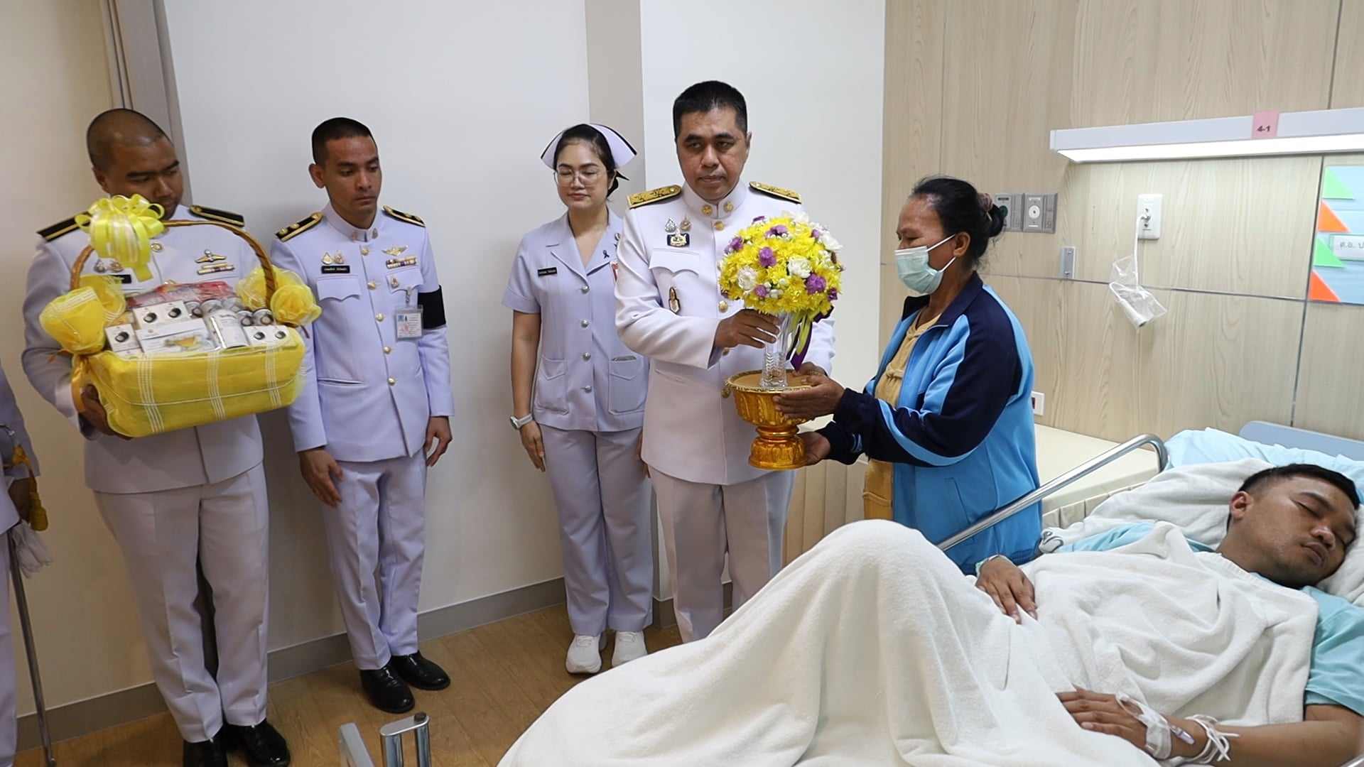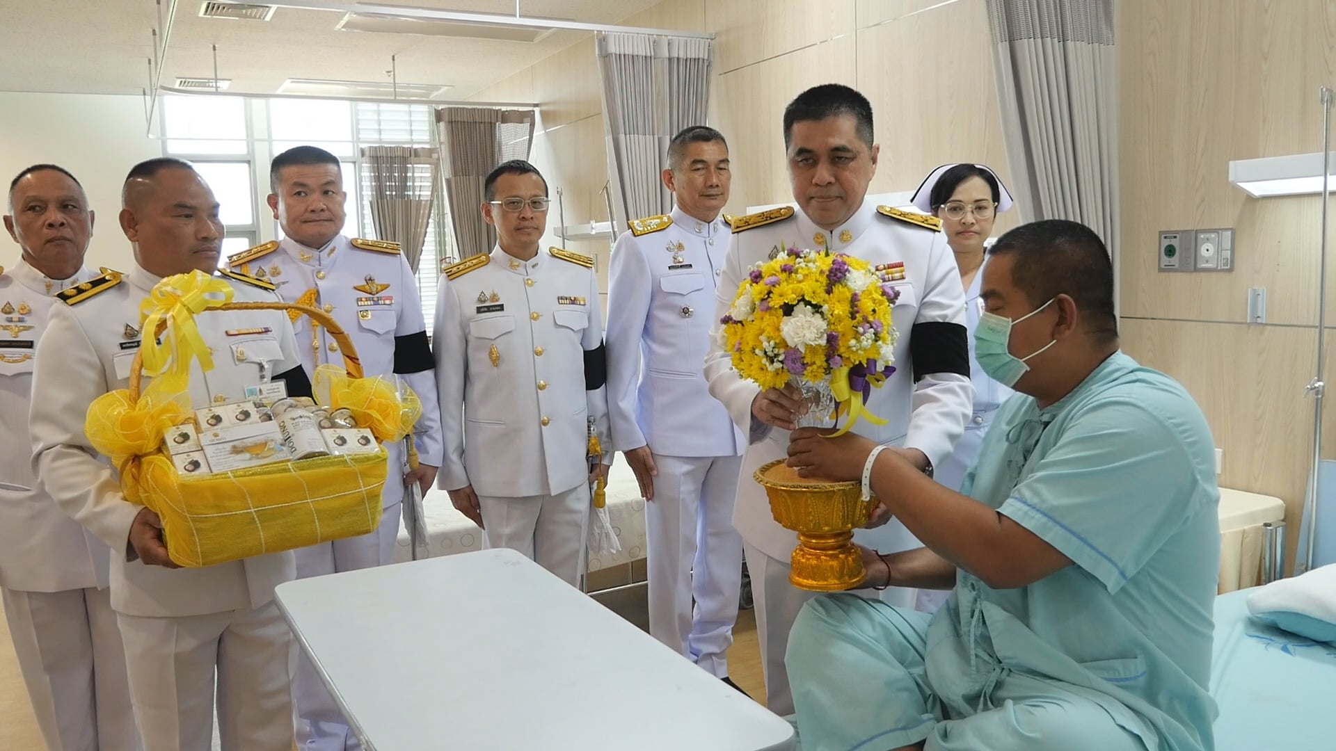 พระบาทสมเด็จพระเจ้าอยู่หัว ทรงพระกรุณาโปรดเกล้าฯ ให้ผู้ว่าราชการจังหวัดนครราชสีมา เชิญแจกันดอกไม้และตะกร้าสิ่งของพระราชทานมอบแก่กำลังพลที่ได้รับบาดเจ็บจากเหตุปะทะชายแดนไทย-กัมพูชา จำนวน 3 นาย ที่รักษาตัวอยู่รพ.ค่ายสุรนารี